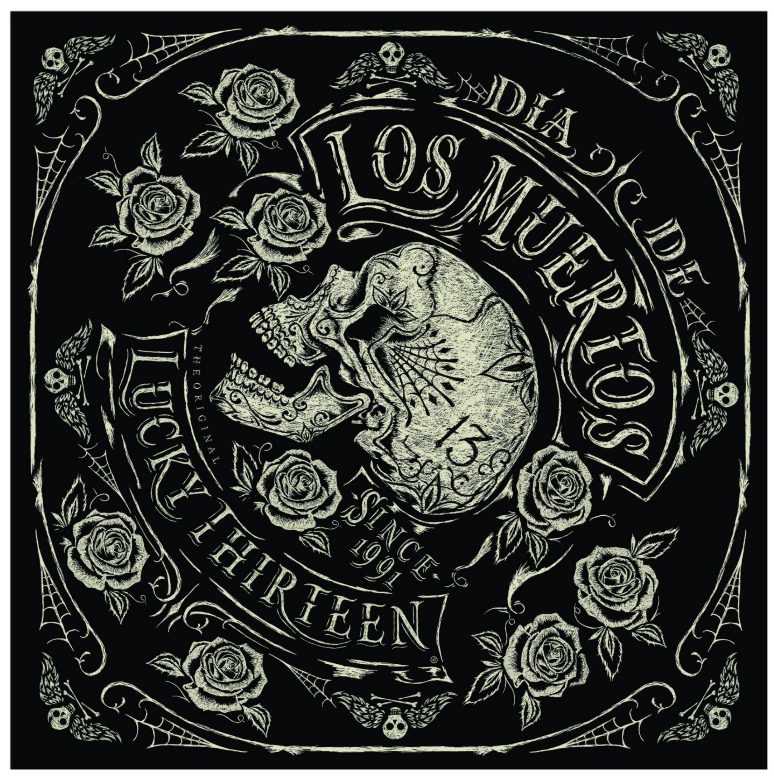 The DEAD SKULL bandana is a 100% cotton bandana, with the "Los Muertos" Lucky 13 graphic printed on one side.