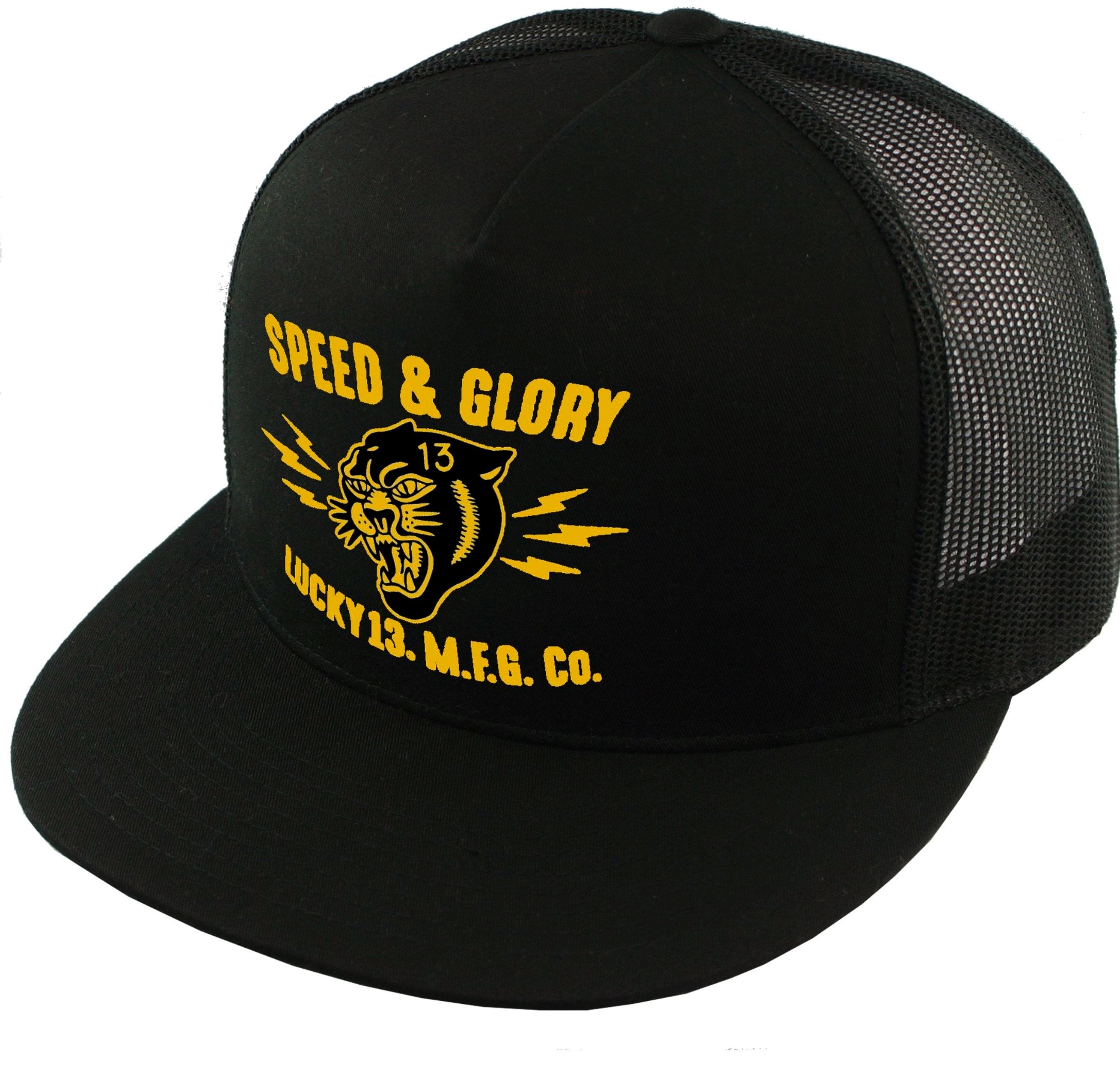 The PANTHER HEAD solid poplin-mesh snapback trucker cap has the retro racing-inspired "Panther Head" graphic on front and a "Lucky 13" embroidered on the back left side. There is an adjustable strap to assist in helping this hat fit almost any size head.