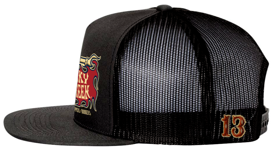The PIPE SKULL poplin-mesh snapback trucker cap has a front graphic of "Pipe Skull" on the front and a "13" embroidered on the back left side. There is an adjustable strap to assist in helping this hat fit almost any size head.