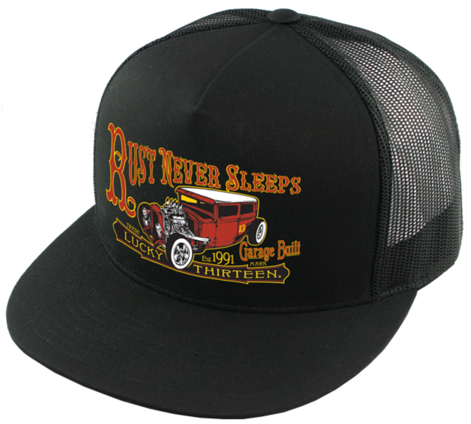 The RUST NEVER SLEEPS poplin-mesh snapback trucker cap has a nice rusty rat rod design called "Rust Never Sleeps" on the front and a "13" embroidered on the back left side. There is an adjustable strap to assist in helping this hat fit almost any size head.