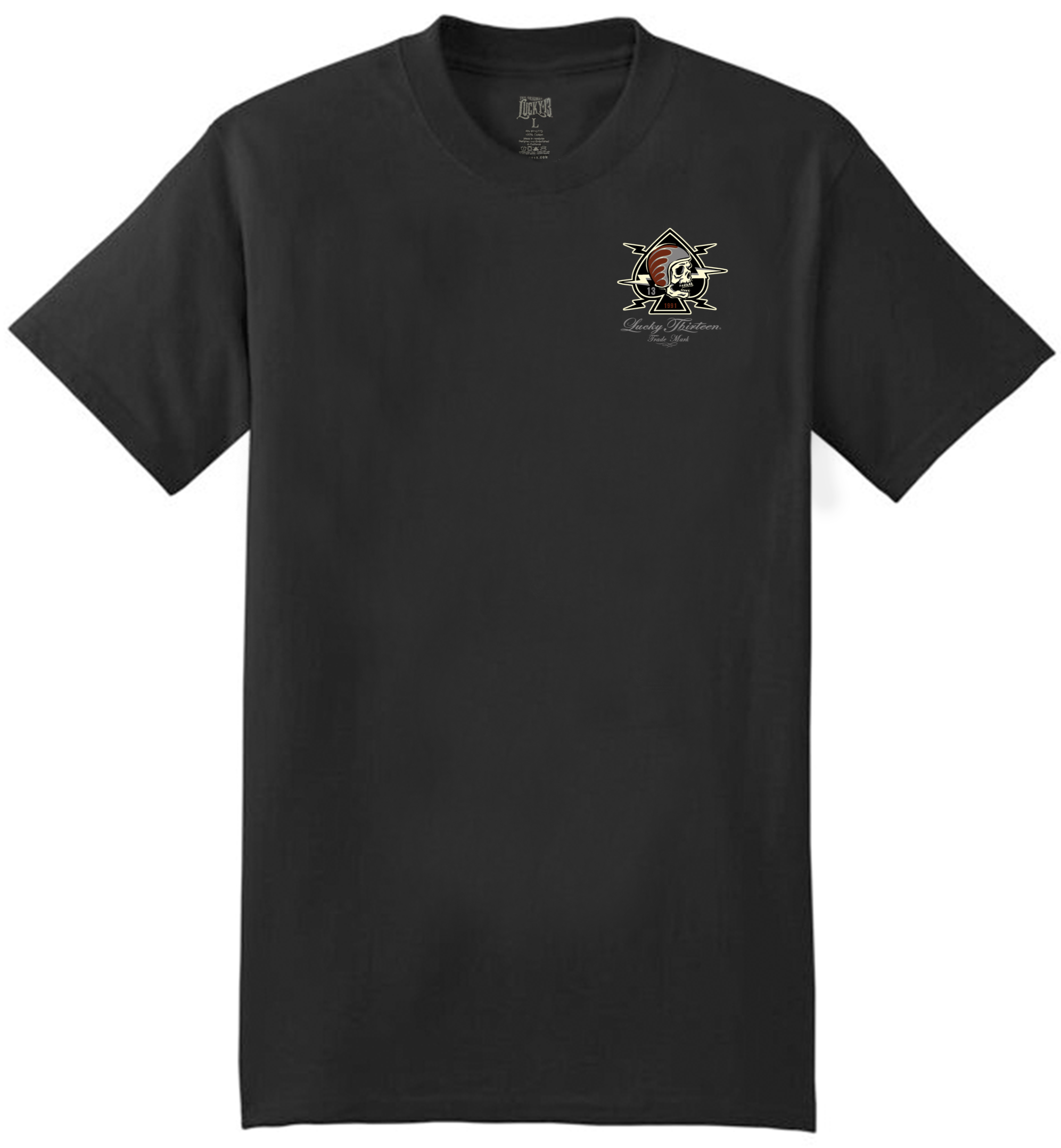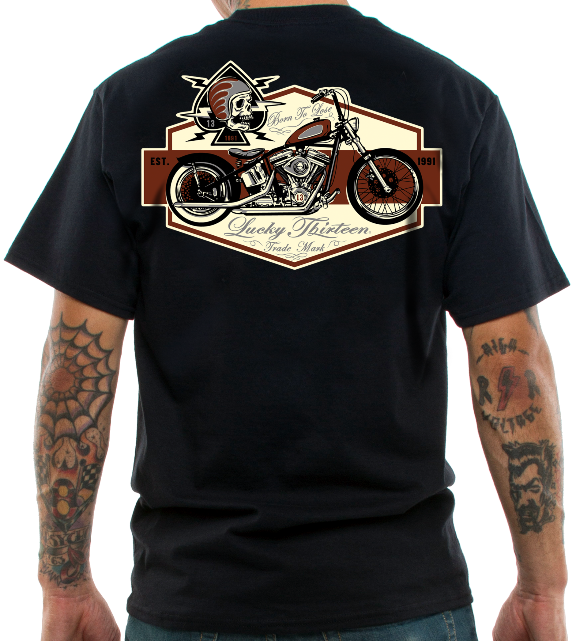 The SKULL BOBBER short sleeve men's tee is made with a 6.1 ounce 100% soft-spun cotton tee with a 1x1 rib-knit collar, shoulder to shoulder taping, cover-seamed neck, and double-needle sleeves. There is a full back screen print of the "Skull Bobber" graphic and a front left chest print to match.
