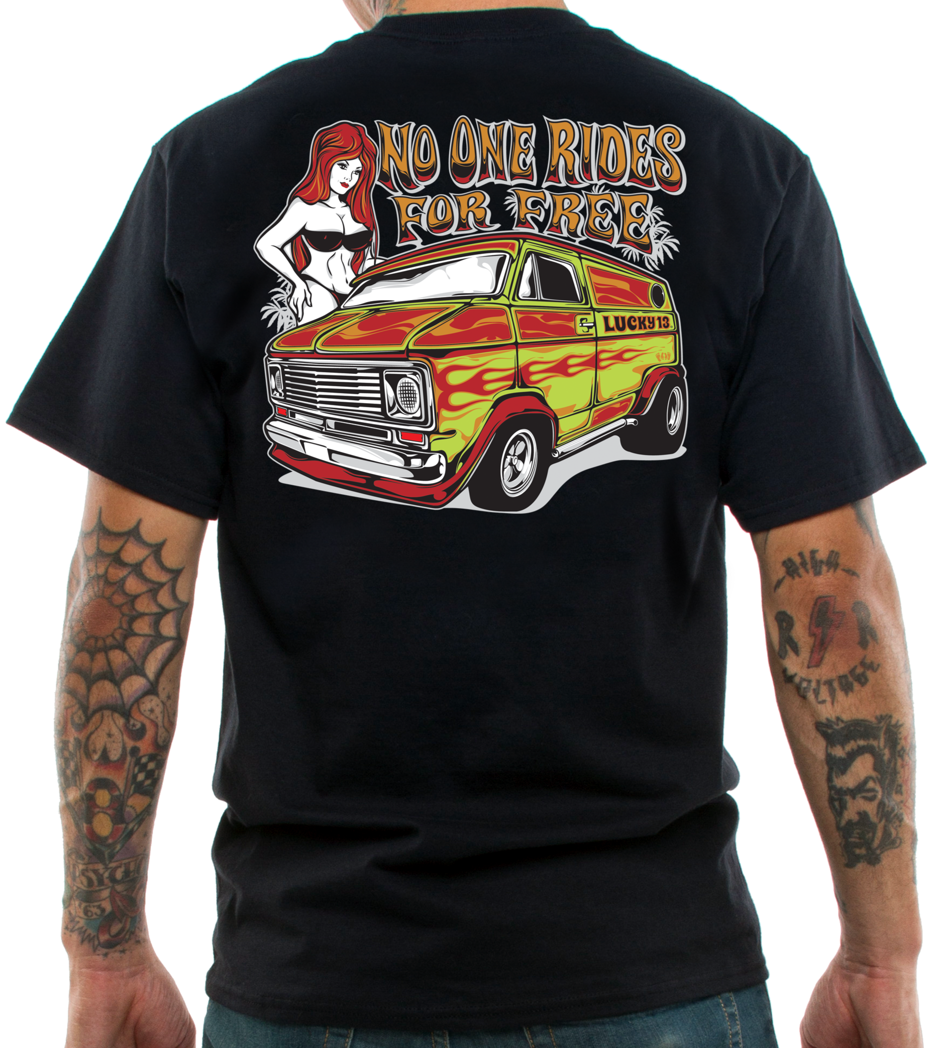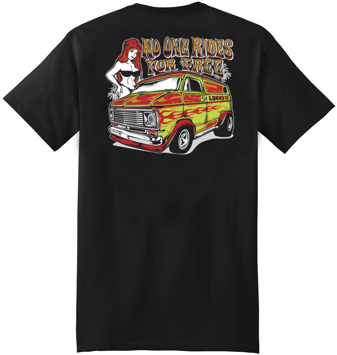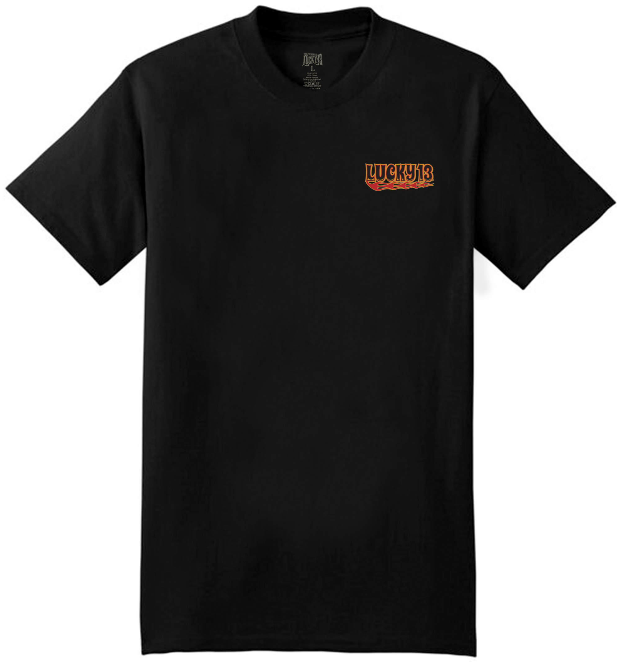 The SUPER VAN short sleeve men's tee is made with a 6.1 ounce 100% soft-spun cotton tee with a 1x1 rib-knit collar, shoulder-to-shoulder taping, cover-seamed neck, and double-needle sleeves. There is a full back screen print of the "Super Van" graphic and front left chest "Lucky 13" pocket logo to match.