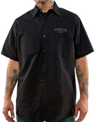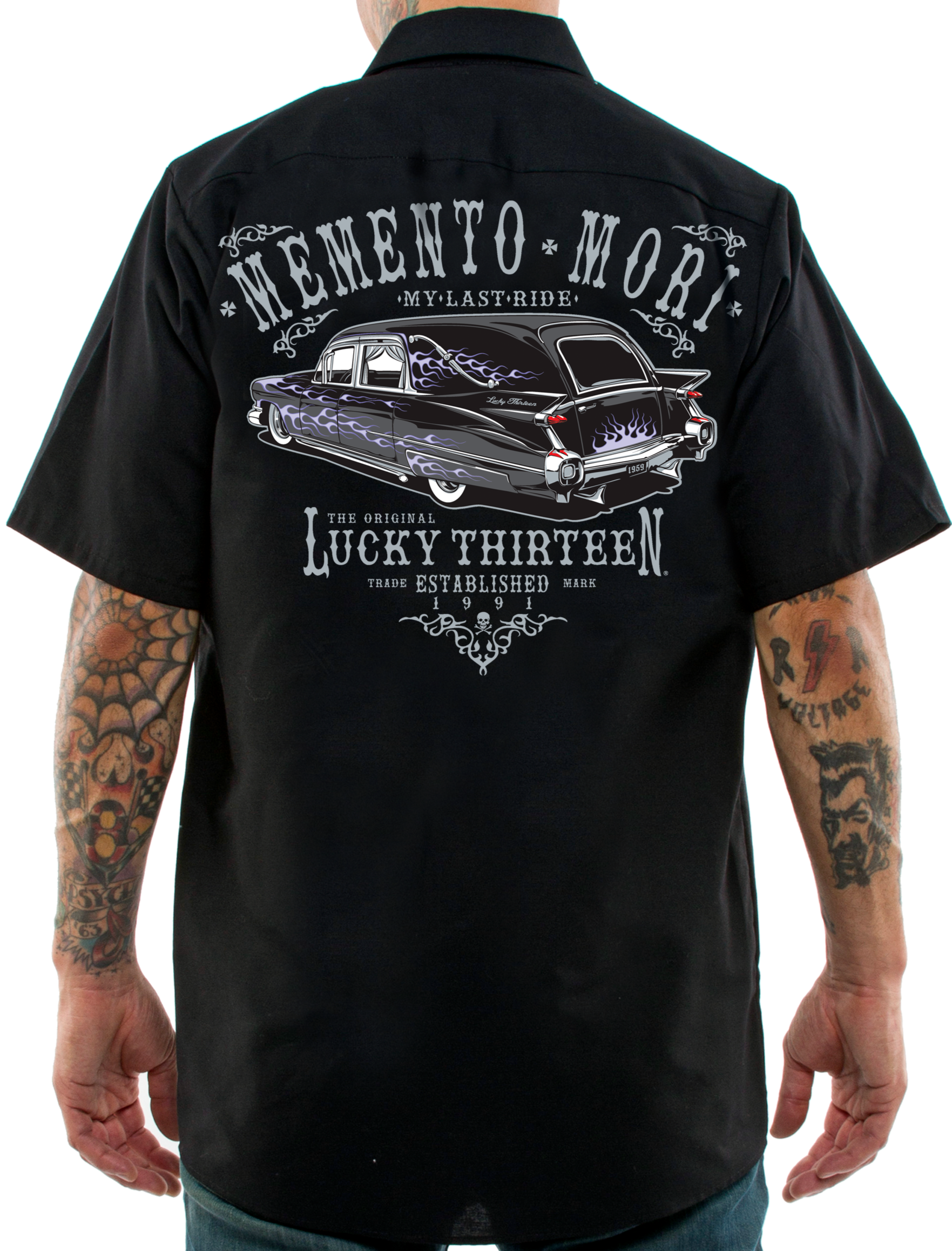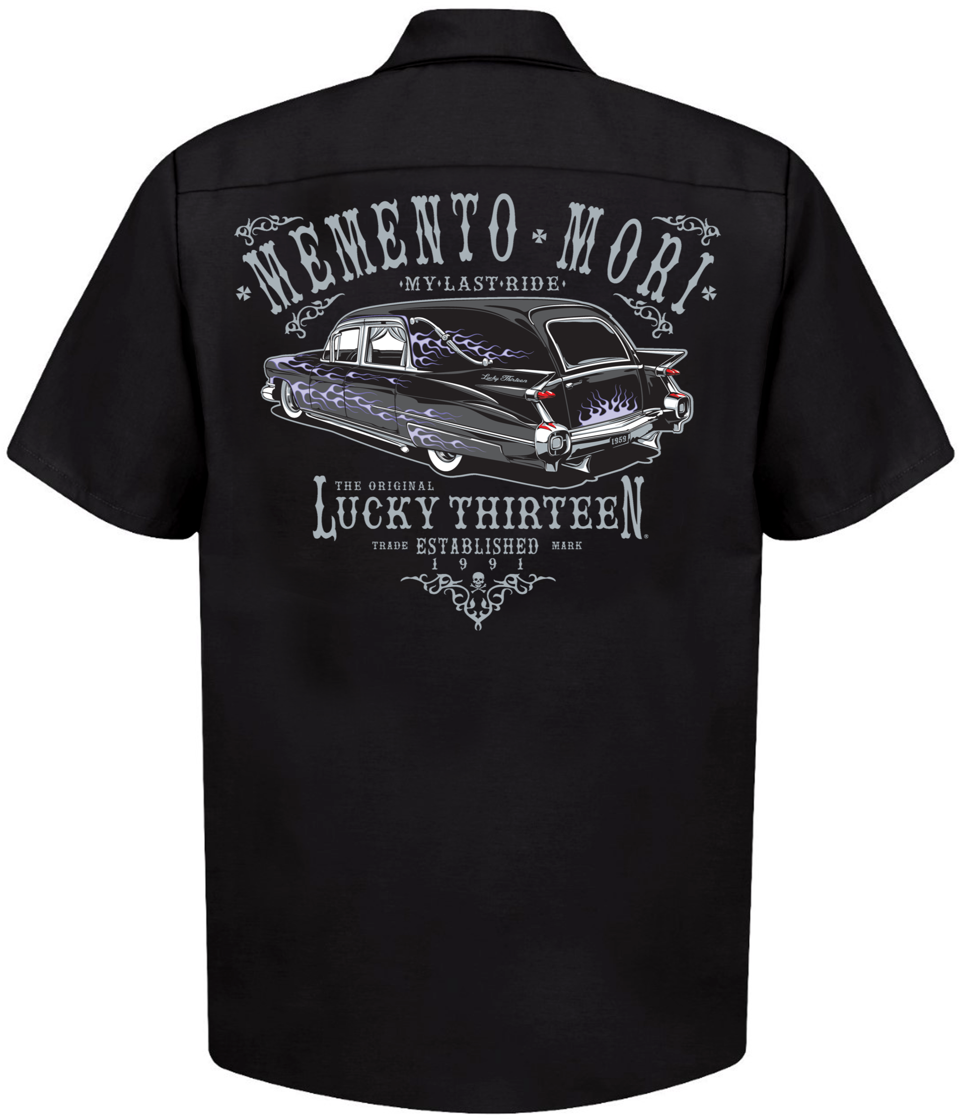 The LAST RIDE Men's short sleeve work shirt is a cotton/poly blend fabric with Touchtex technology, which has superior color retention, soil resistance, durable press and wick-ability. It has a two-piece lined collar with sewn-in stays, six button front with gripper at the neck. Two button-through, hex-style pockets with a front left chest "Lucky 13 - 1991" embroidered logo. The back is printed with the LAST RIDE hearse design.