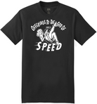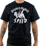 The OFFERINGS PIN UP short sleeve men's tee is made with a 6.1 ounce 100% soft-spun cotton tee with a 1x1 rib-knit collar, shoulder to shoulder taping, cover-seamed neck, and double-needle sleeves. There is a full front chest screen print of the "Offerings To The God Of Speed".