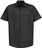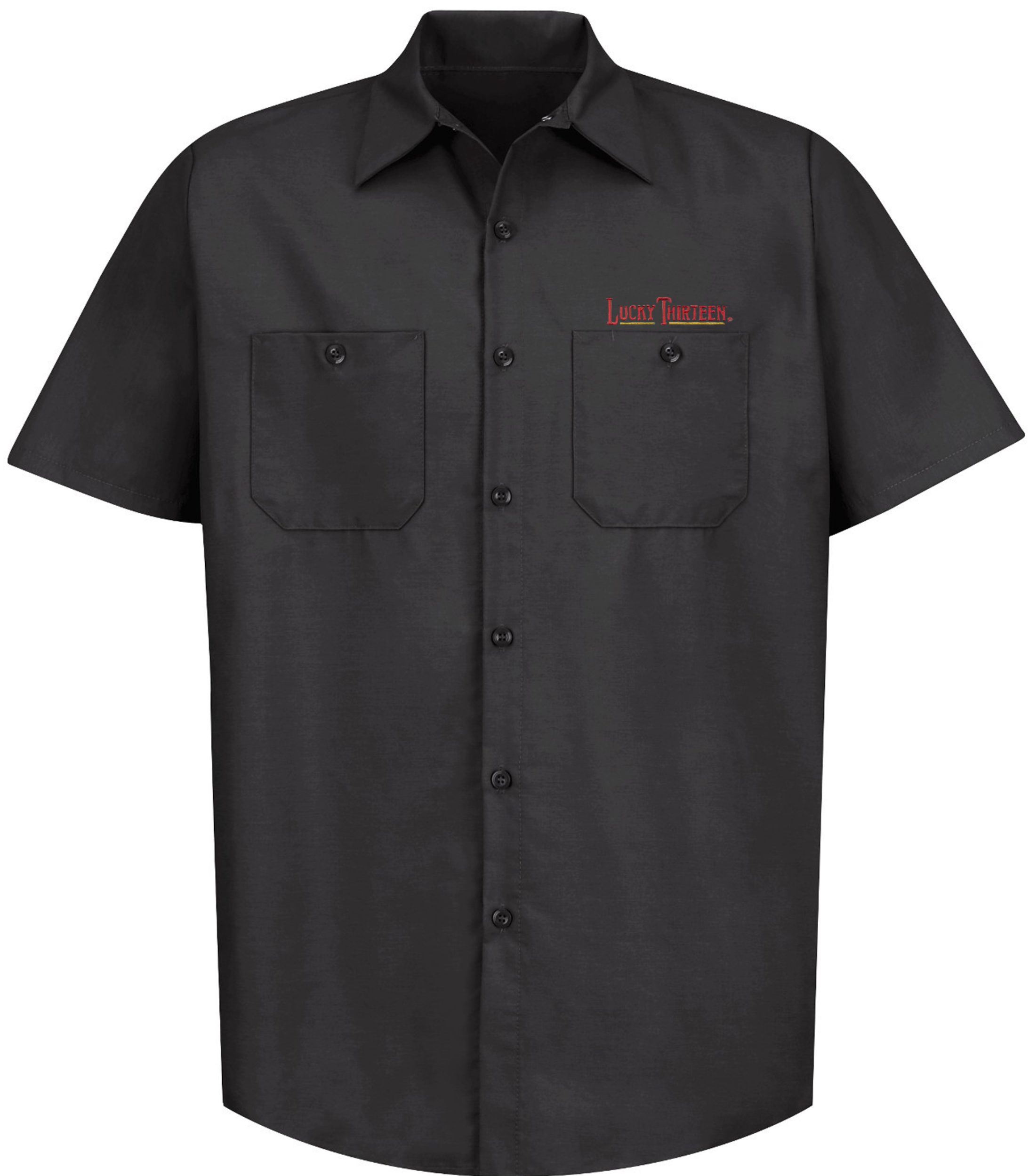 The RUST NEVER SLEEPS men's short sleeve work shirt is a cotton/poly blend fabric with Touchtex technology, which has superior color retention, soil resistance, durable press, and wick-ability. It has a two-piece lined collar with sewn-in stays, six-button front with a gripper at the neck. Two button-through, hex-style pockets with a front left chest "Lucky 13" embroidered logo and a full back screen print of the "Rust Never Sleeps" rat rod design.