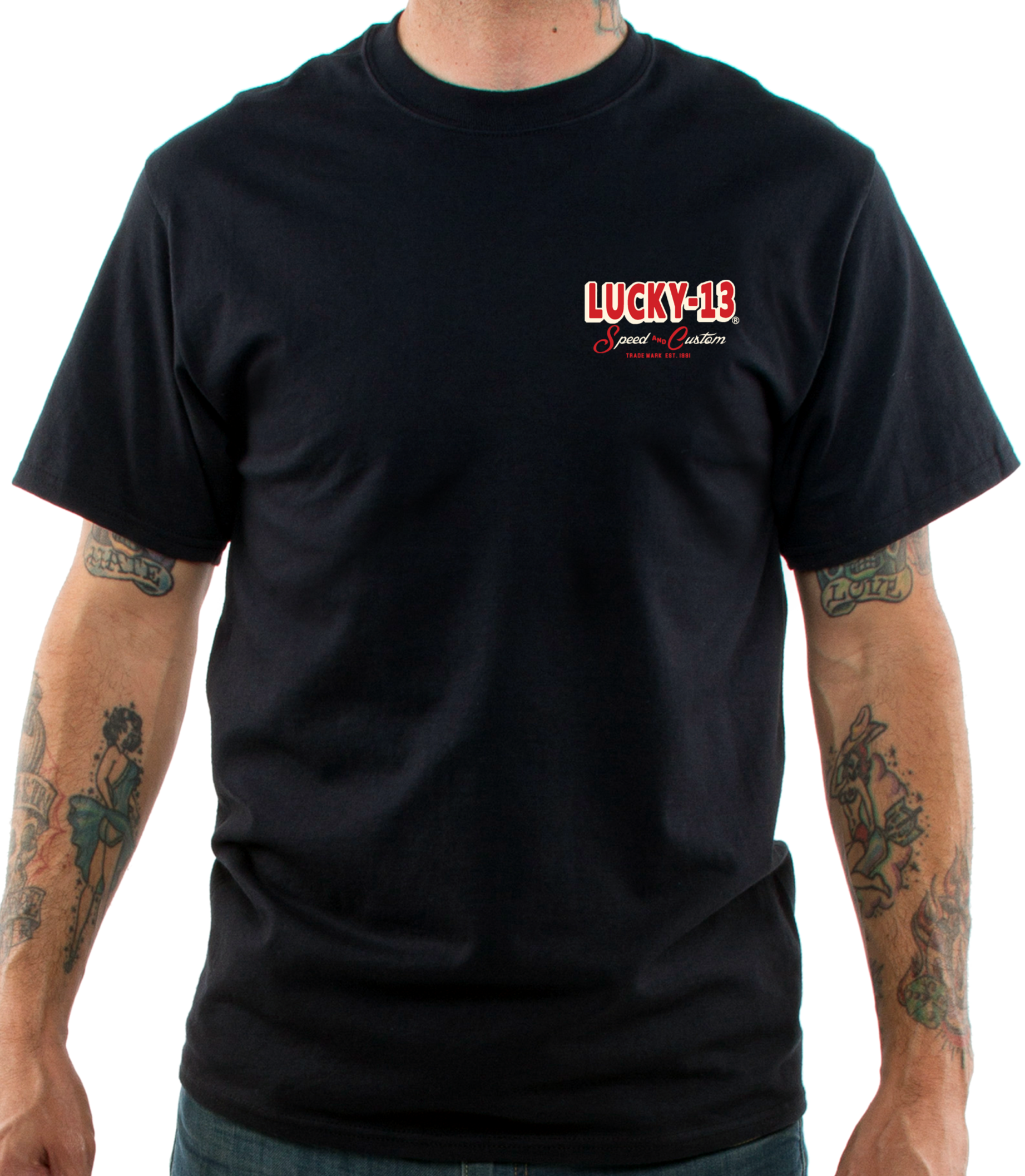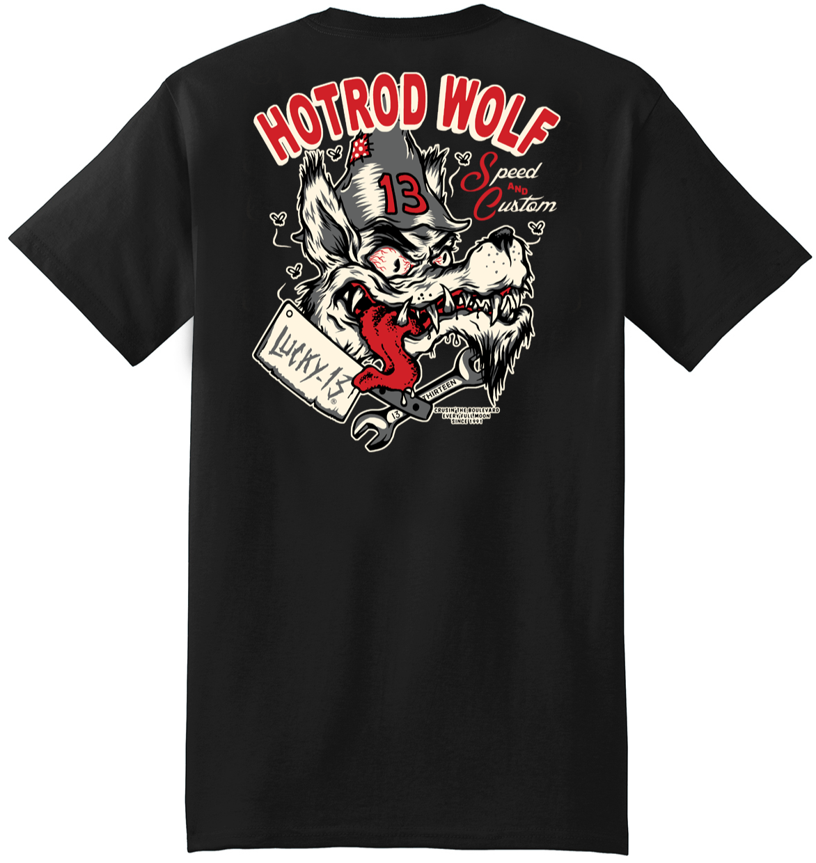 The HOT ROD WOLF short sleeve men's tee is made with a 6.1 ounce 100% soft-spun cotton tee with a 1x1 rib-knit collar, shoulder to shoulder taping, cover-seamed neck, and double-needle sleeves. There is a full back screen print of the "Hot Rod Wolf" graphic and a front left chest print to match.
