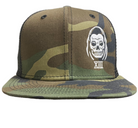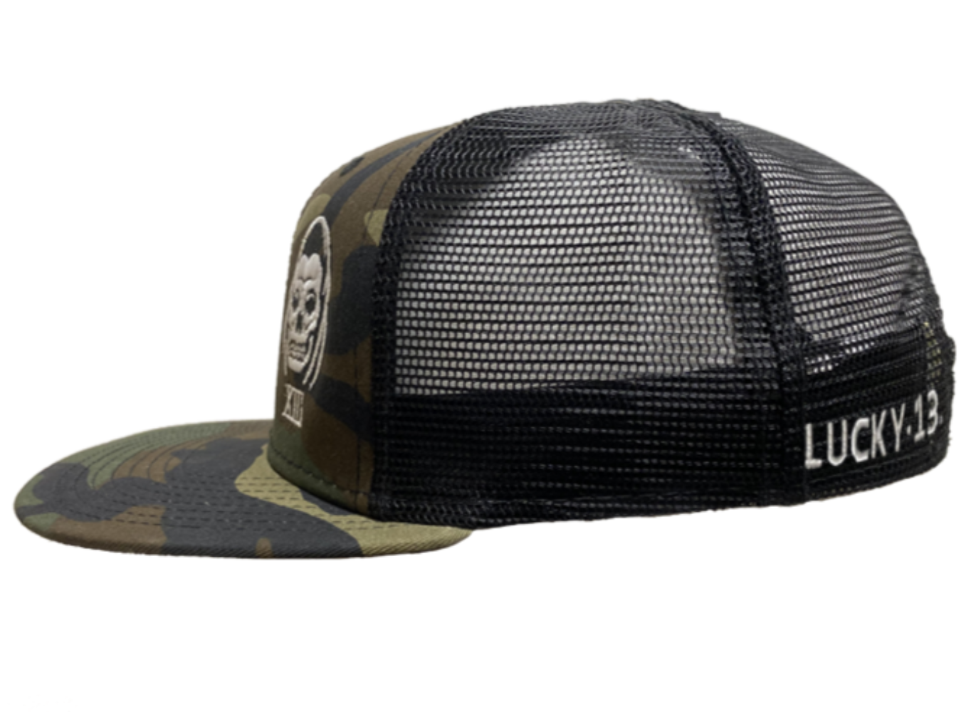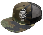 The SPEED REAPER 6-panel two-tone snapback trucker cap has a traditional green camouflage fabric front panel, with a black polyester mesh back. The bill is camo on top and black underneath. The cap is embroidered with the Grim Reaper on the front left panel with "XIII" underneath him, and Lucky Thirteen on the side.