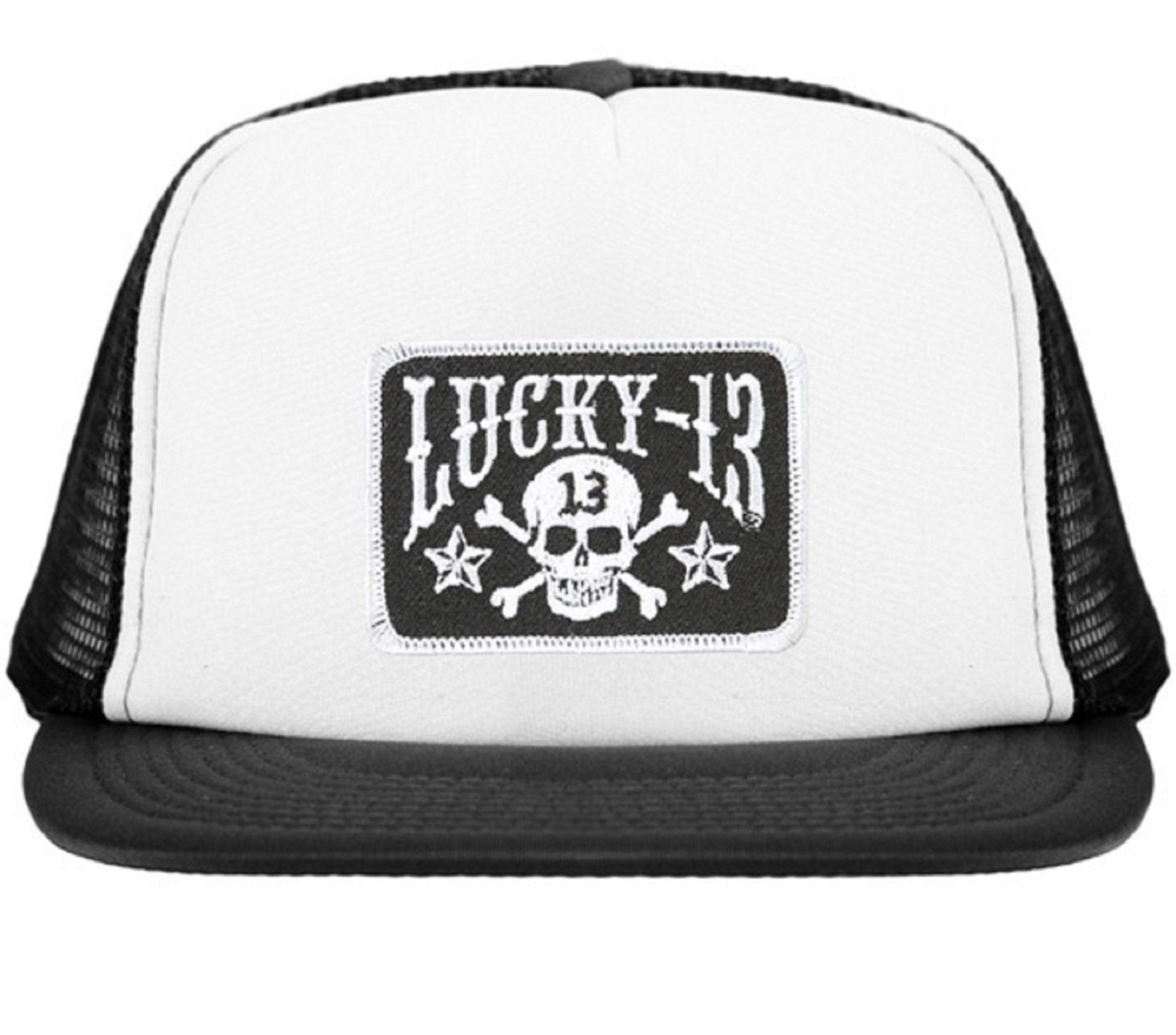 The SKULL STARS flat bill trucker cap with an embroidered patch with "Skull Stars" patch on front, a small side embroidery hit on the mesh, and a snap-back adjustable.