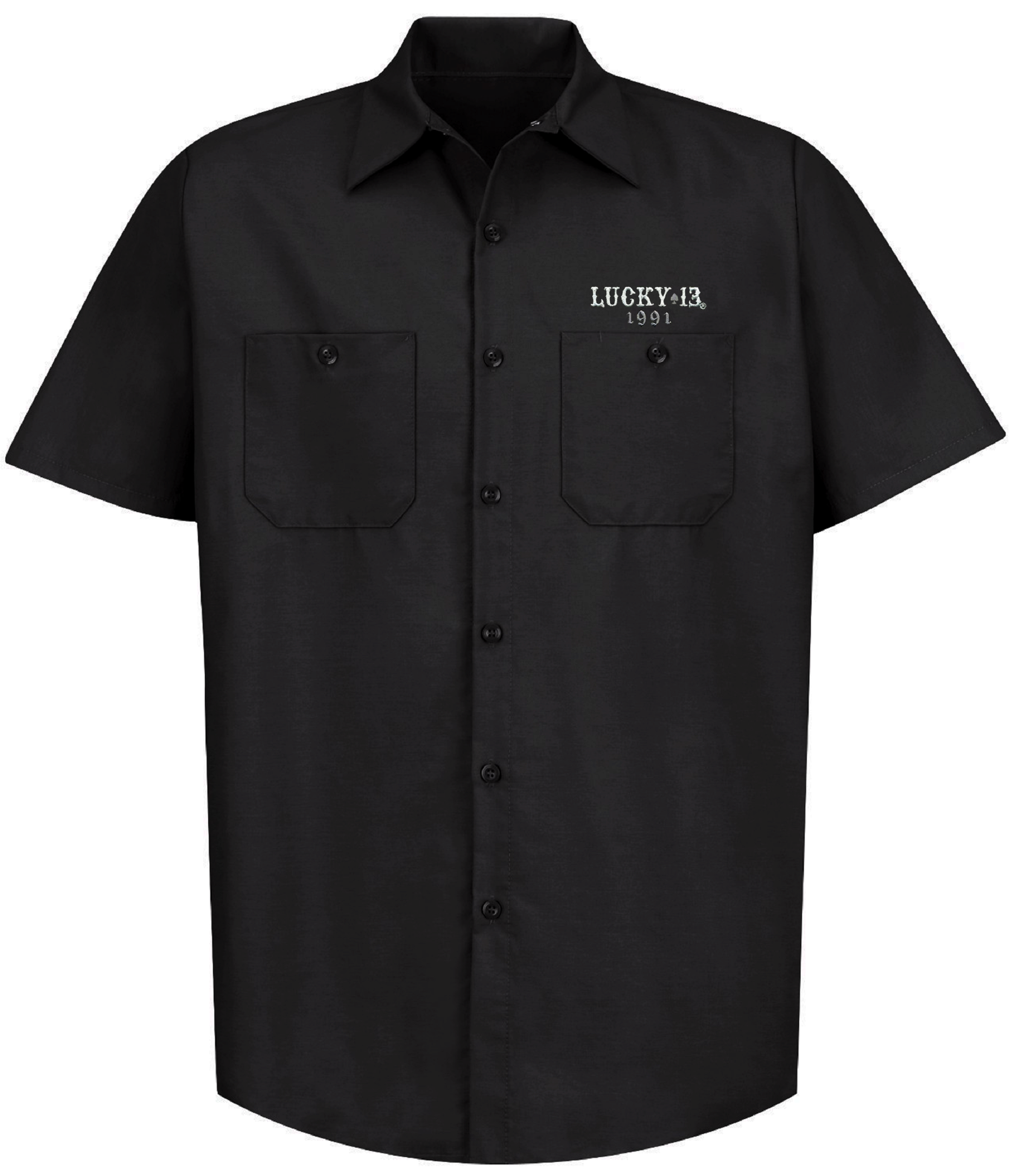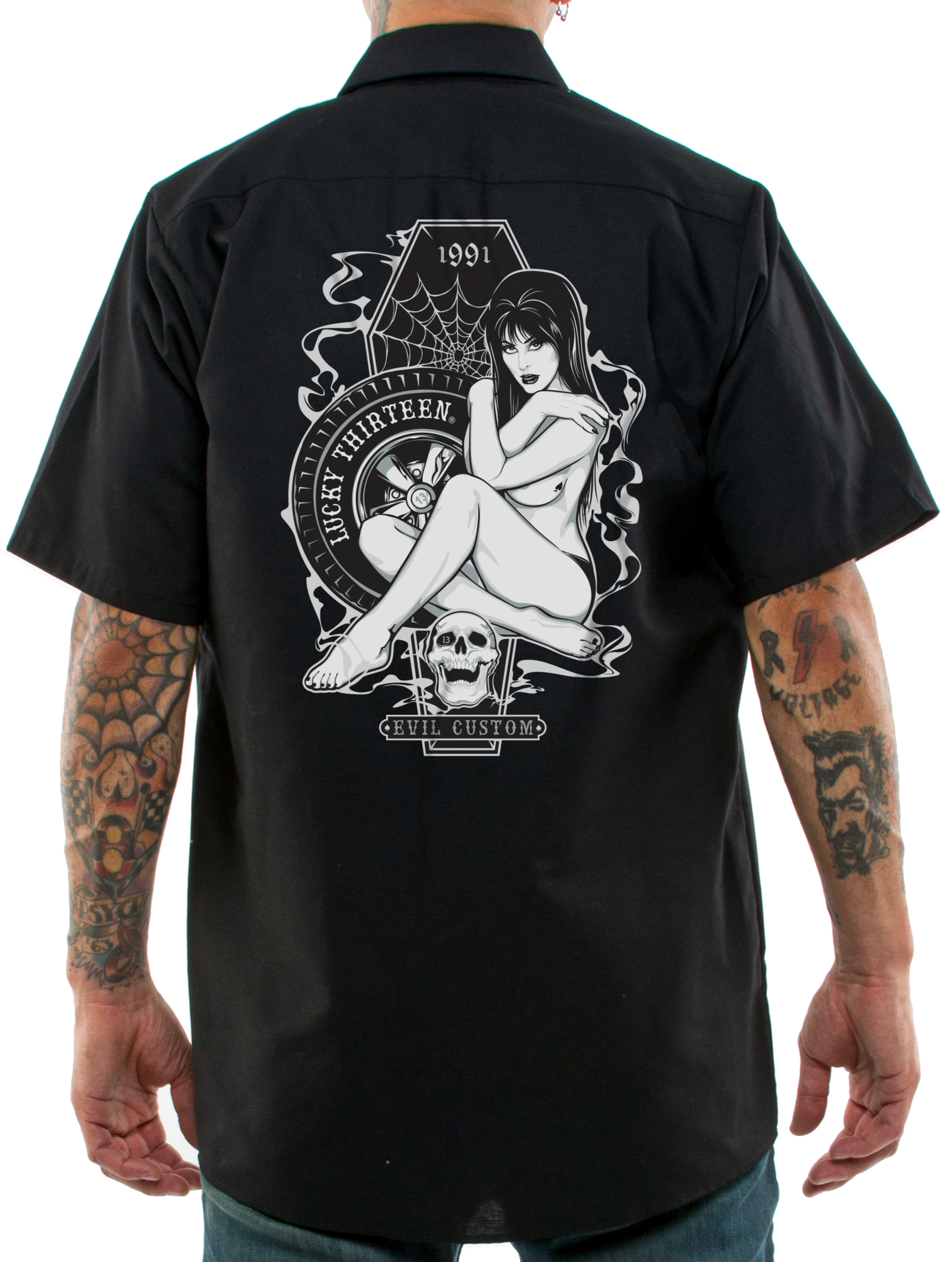 The MISS TRUST Men's short sleeve work shirt is a cotton/poly blend fabric with Touchtex technology, which has superior color retention, soil resistance, durable press and wick-ability. It has a two-piece lined collar with sewn-in stays, six button front with gripper at the neck. Two button-through, hex-style pockets with a front left chest "Lucky 13" embroidered logo. The back is printed with MISS TRUST graphic of a black haired vamp sitting in front of a coffin and wheel.