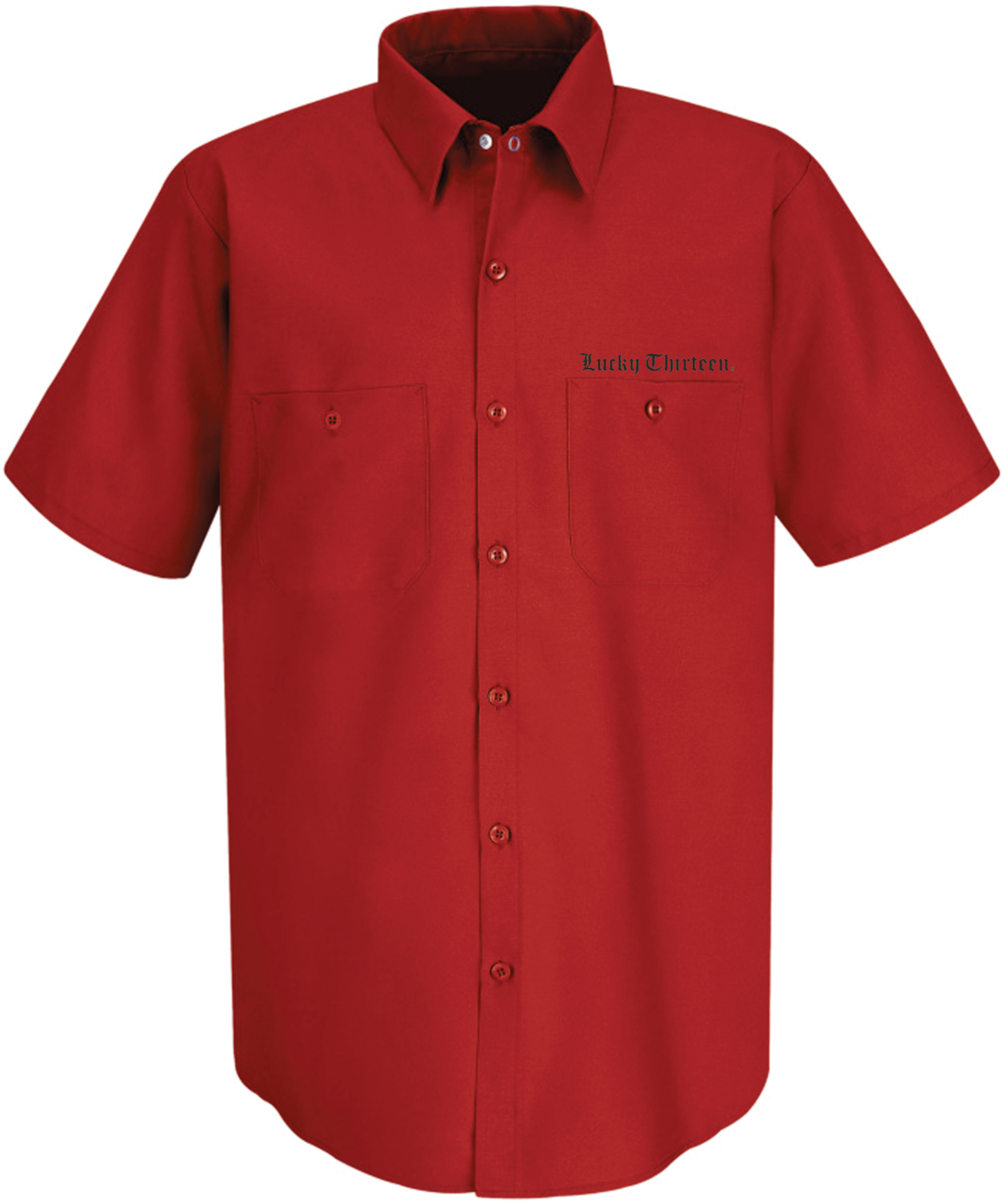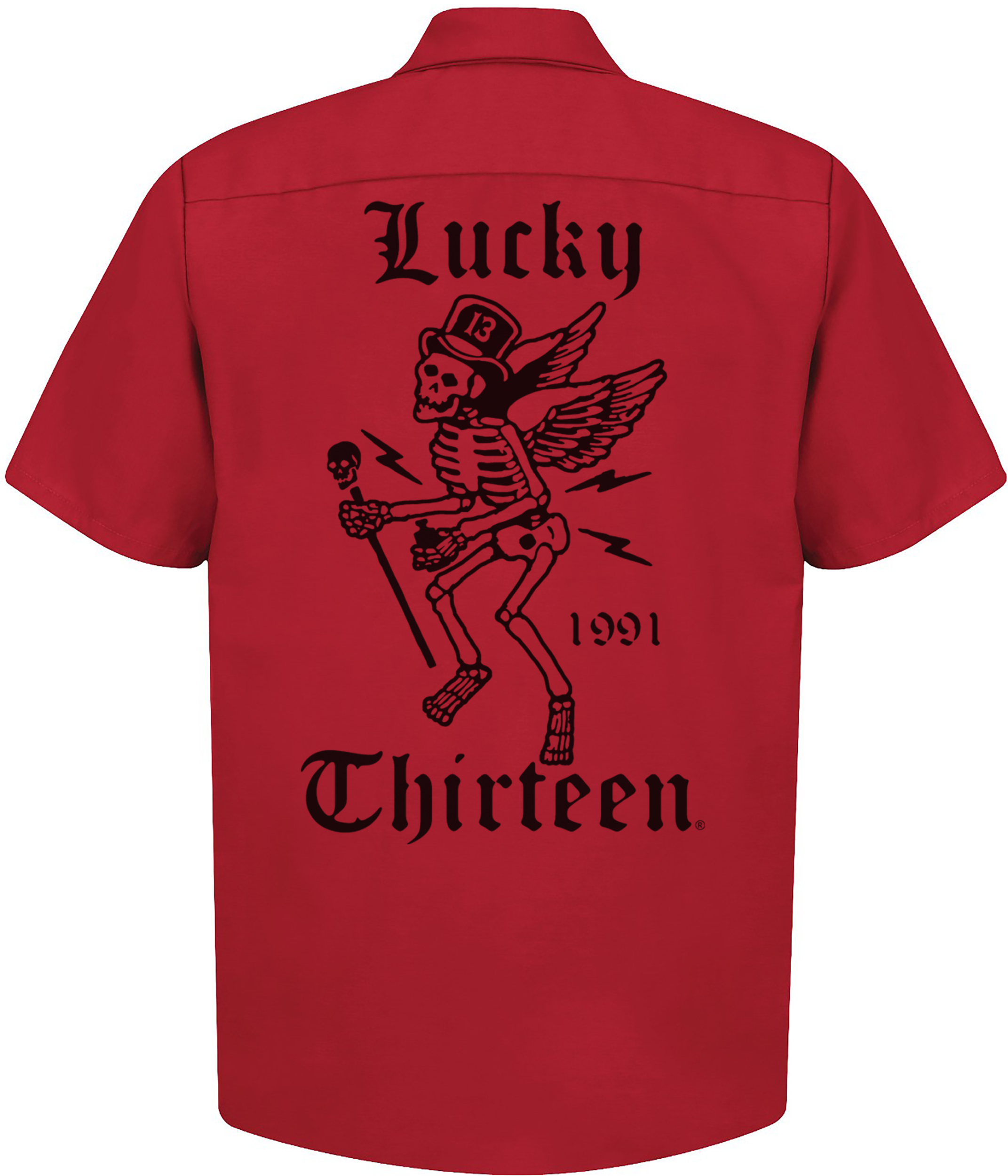 The WINGED SKULLY short sleeve work shirt is a cotton/poly blend fabric with Touchtex technology, which has superior color retention, soil resistance, durable press, and wick-ability. It has a two-piece lined collar with sewn-in stays, six-button front with gripper at the neck. Two button-through, hex-style pockets with a "Lucky Thirteen" embroidery above the left one. There is a full back print of the old school "Winged Skully" design.