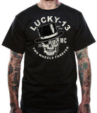 The TWO WHEEL HATTER short sleeve men's tee is made with a 6.1 ounce 100% soft-spun cotton tee with a 1x1 rib knit collar, shoulder to shoulder taping, cover-seamed neck, and double needle sleeves. There is a front chest print of the Lucky 13 "Two Wheel Hatter" graphic in bone. Two Wheels Forever!