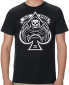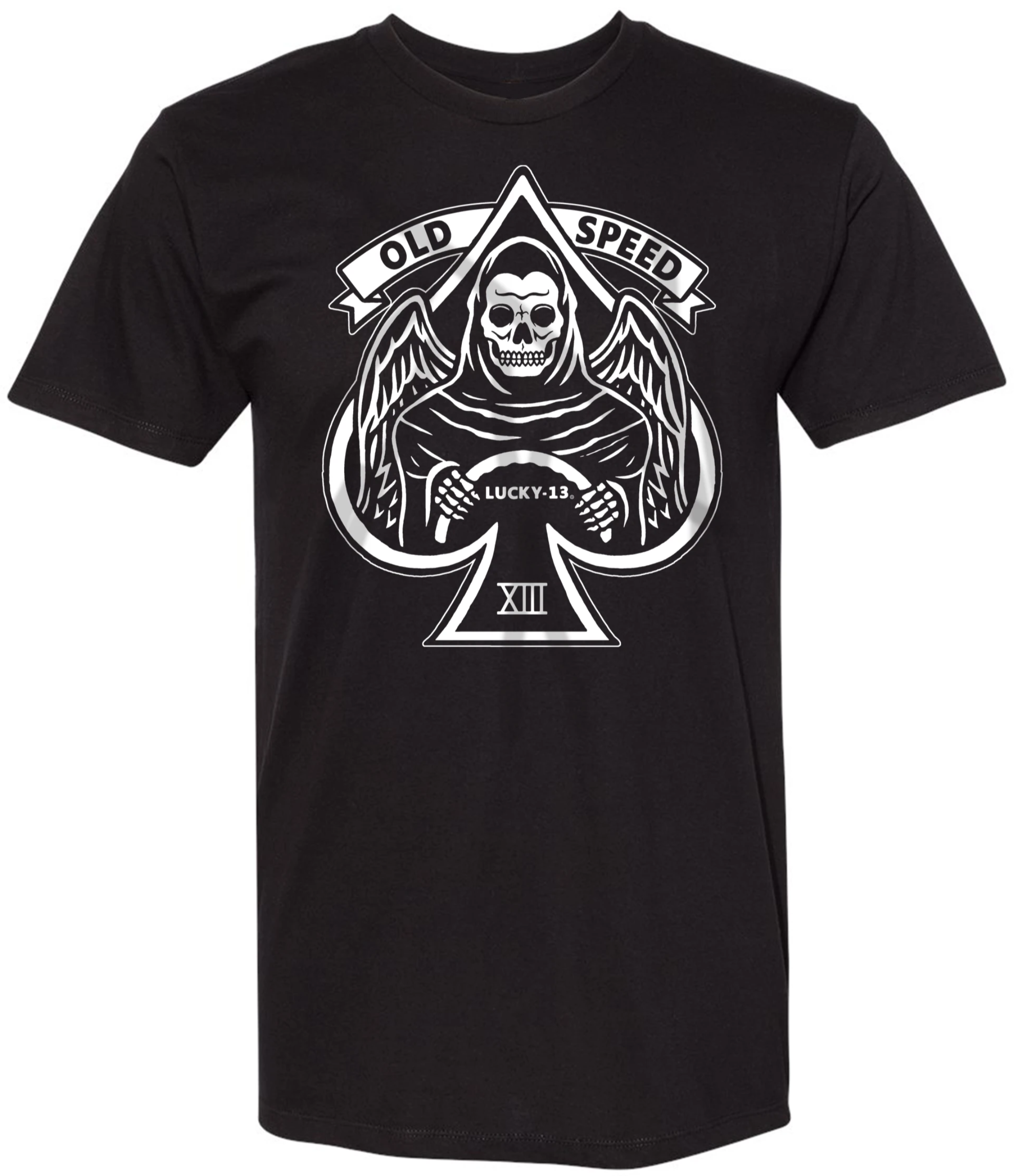 The SPEED REAPER slim fit tee is a 4.3 ounce preshrunk combed ringspun cotton short sleeve men's tee with double-needle sleeve and bottom hem. The full front chest is printed with the "Speed Reaper" set in a Spade with Old Speed in a banner overhead. This tee is NAFTA compliant.