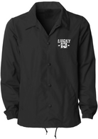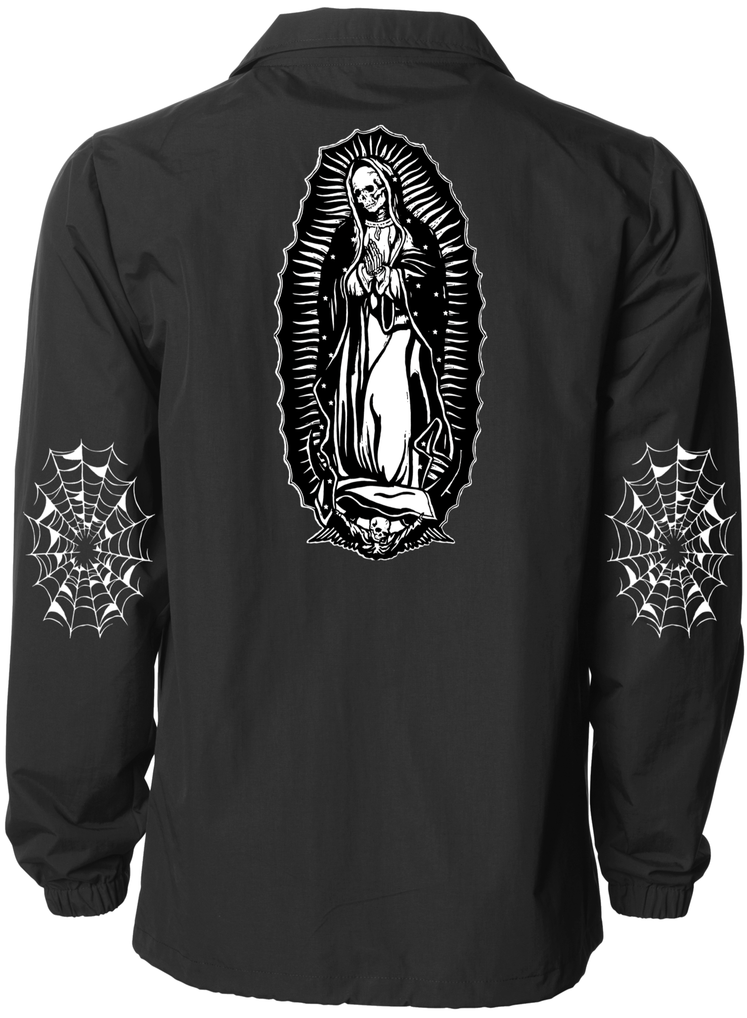 The LOOPS water-resistant windbreaker jacket has a 100% nylon outer shell with a water-proof coating and a PU-coated inner shell with a standard fit. It has antique brass eyelets, a six-snap front closure, elastic cuffs, underarm grommets, and a drawcord at the bottom. We have our Dia De Los Muertos-inspired Virgin graphic on the back, spider webs on the elbows, and a Lucky 13 logo on the front left chest.