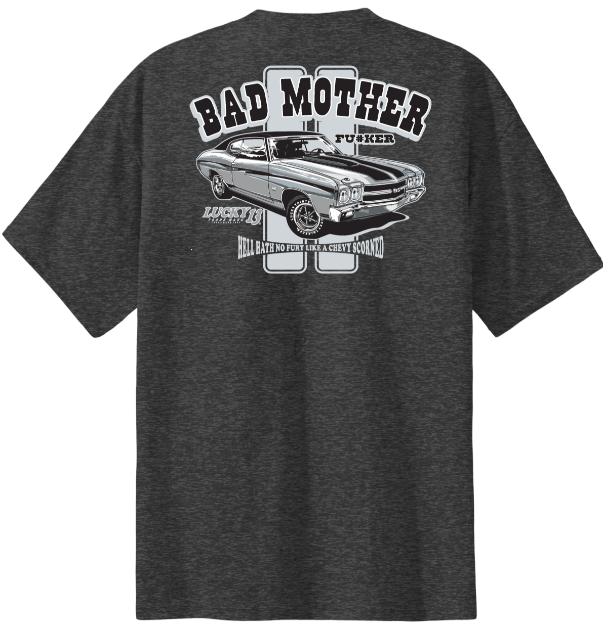 The BAD MOFO short sleeve men's tee is made with a 6.1-ounce 50/50 soft-spun poly/cotton tee with a 1x1 rib-knit collar, shoulder-to-shoulder taping, cover-seamed neck, and double-needle sleeves. There is a full back screen print of the "Bad Mofo" graphic of a classic Chevelle SS. There is a front left chest Lucky 13 logo to match.