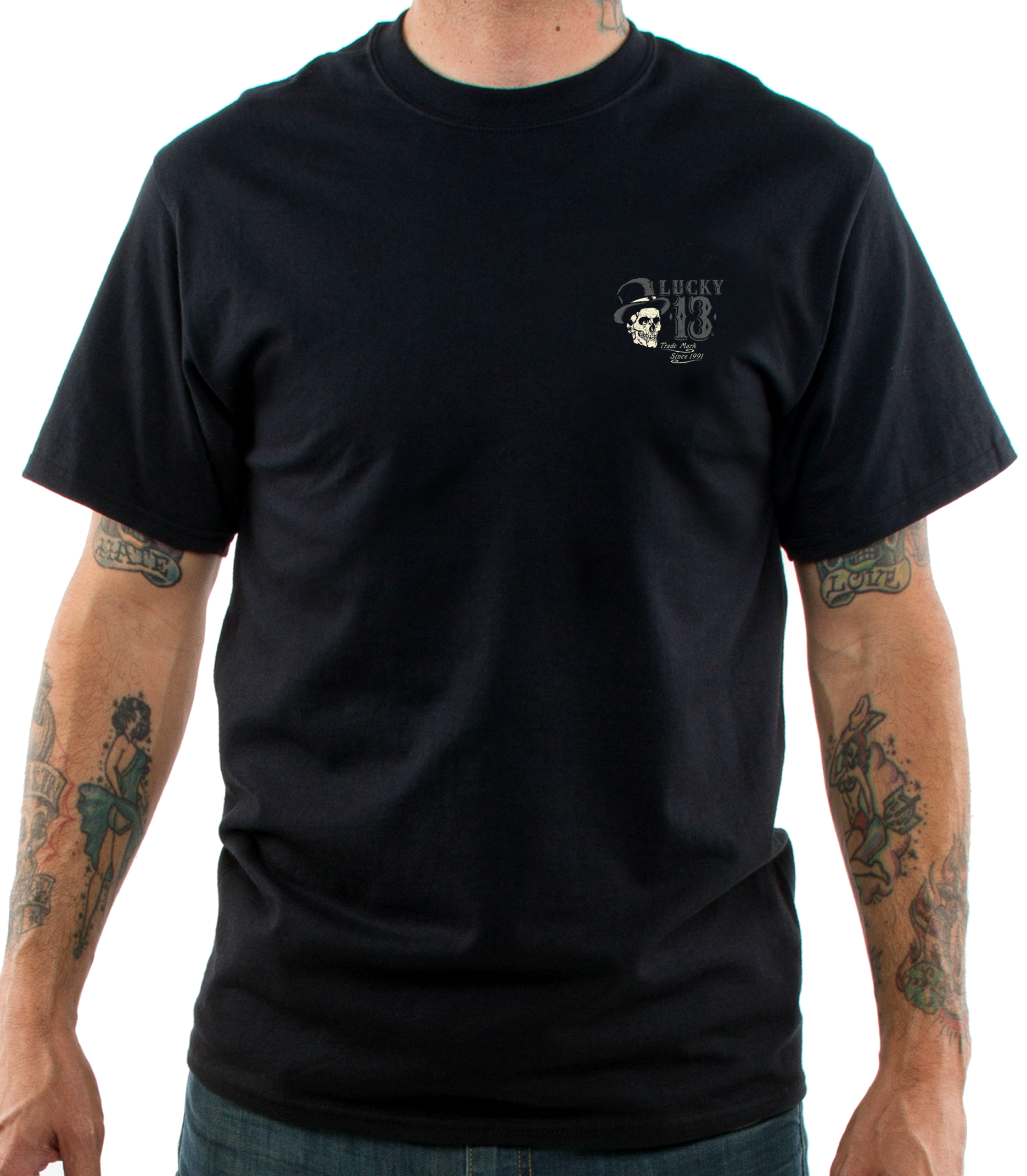 The DEAD RANCH short sleeve men's tee is made with a 6.1 ounce 100% soft-spun cotton tee with a 1x1 rib-knit collar, shoulder to shoulder taping, cover-seamed neck, and double-needle sleeves. There is a full back screen print of the "Dead Ranch" graphic, and a front left chest "Lucky 13" logo to match.