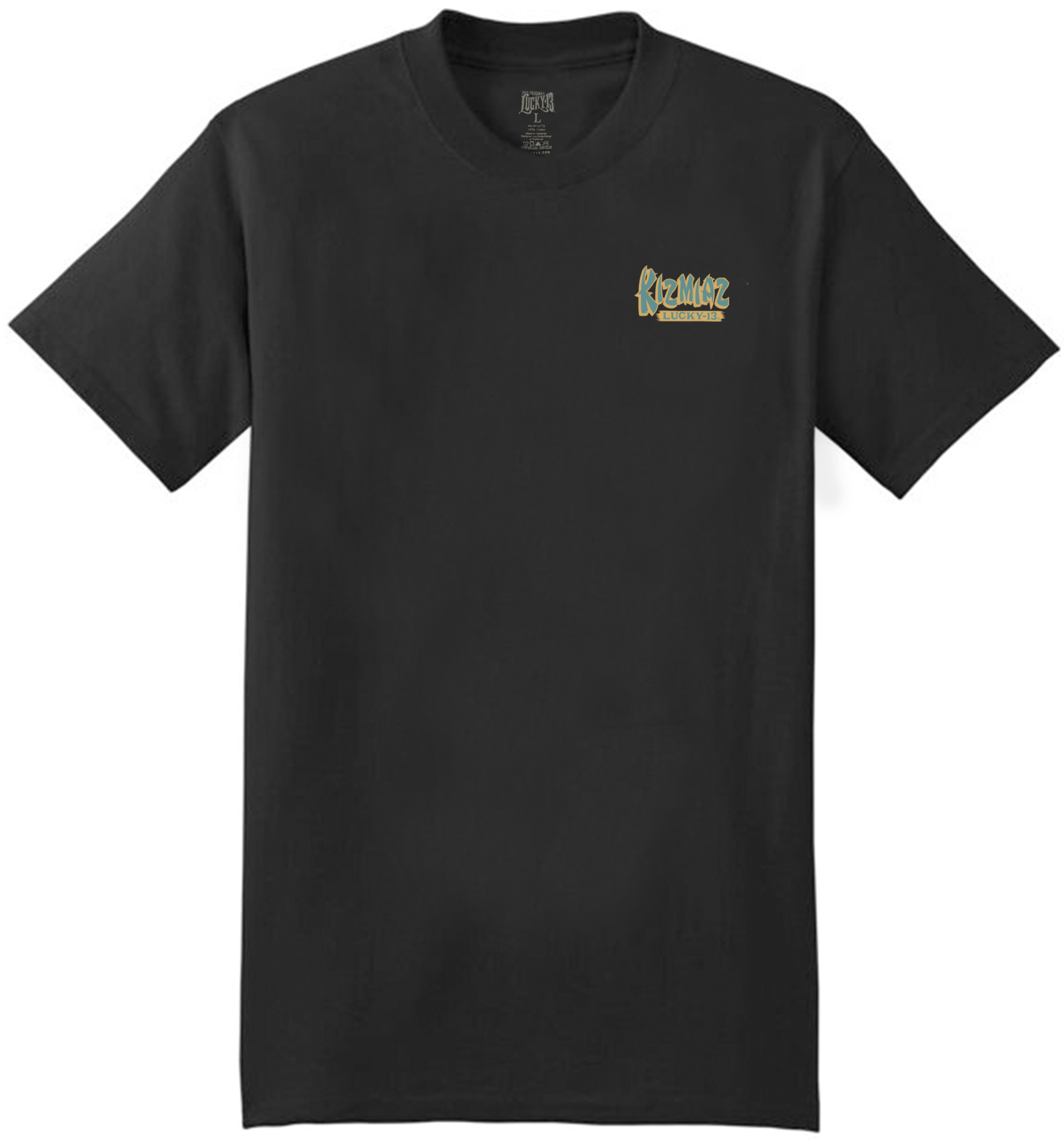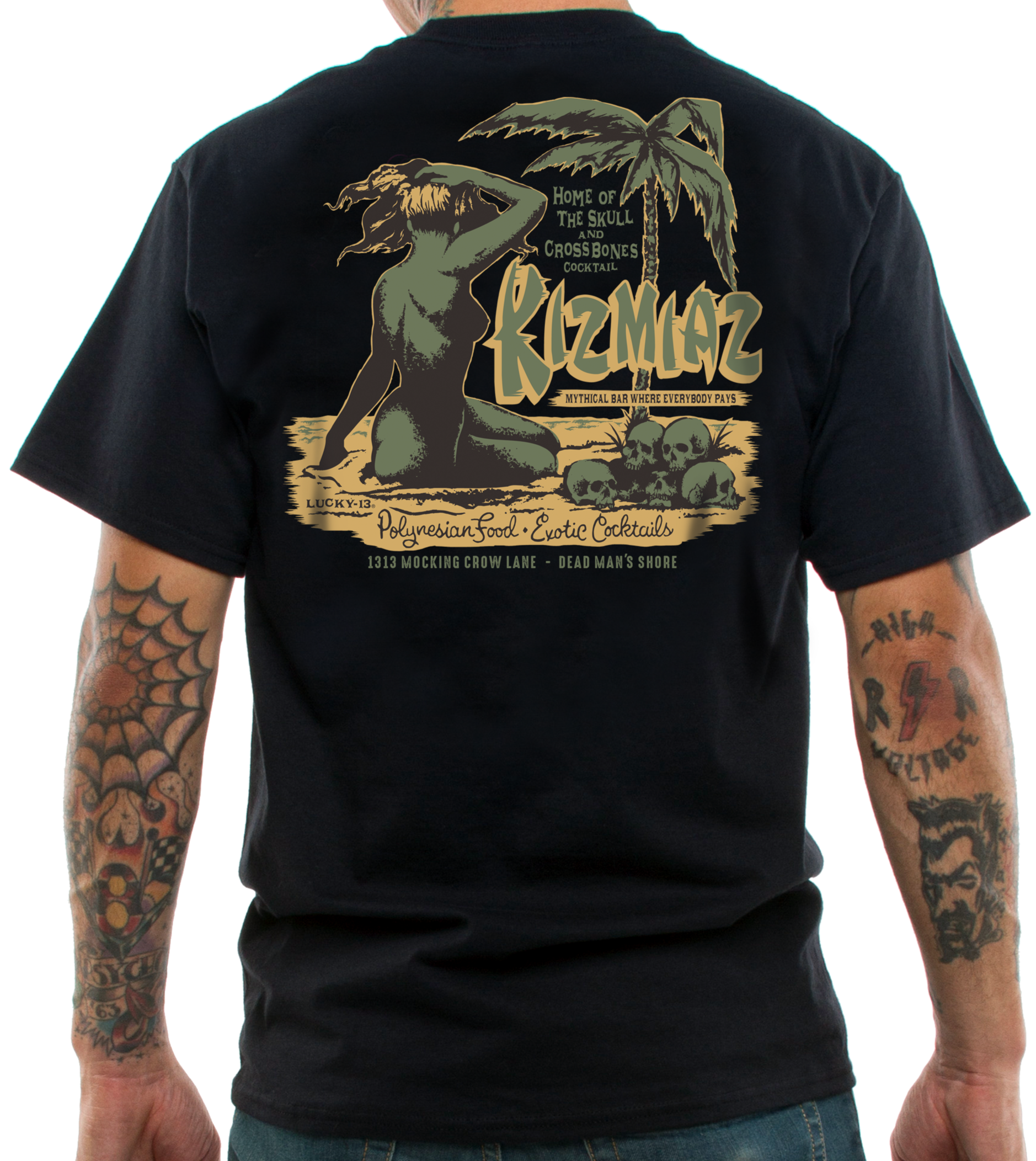 The KIZMIAZ short sleeve men's tee is made with a 6.1-ounce 100% soft-spun cotton tee with a 1x1 rib-knit collar, shoulder-to-shoulder taping, cover-seamed neck, and double-needle sleeves. There is a full back screen print of the vintage matchbook-inspired "Kizmiaz" graphic. There is a front left chest Lucky 13 logo to match.
