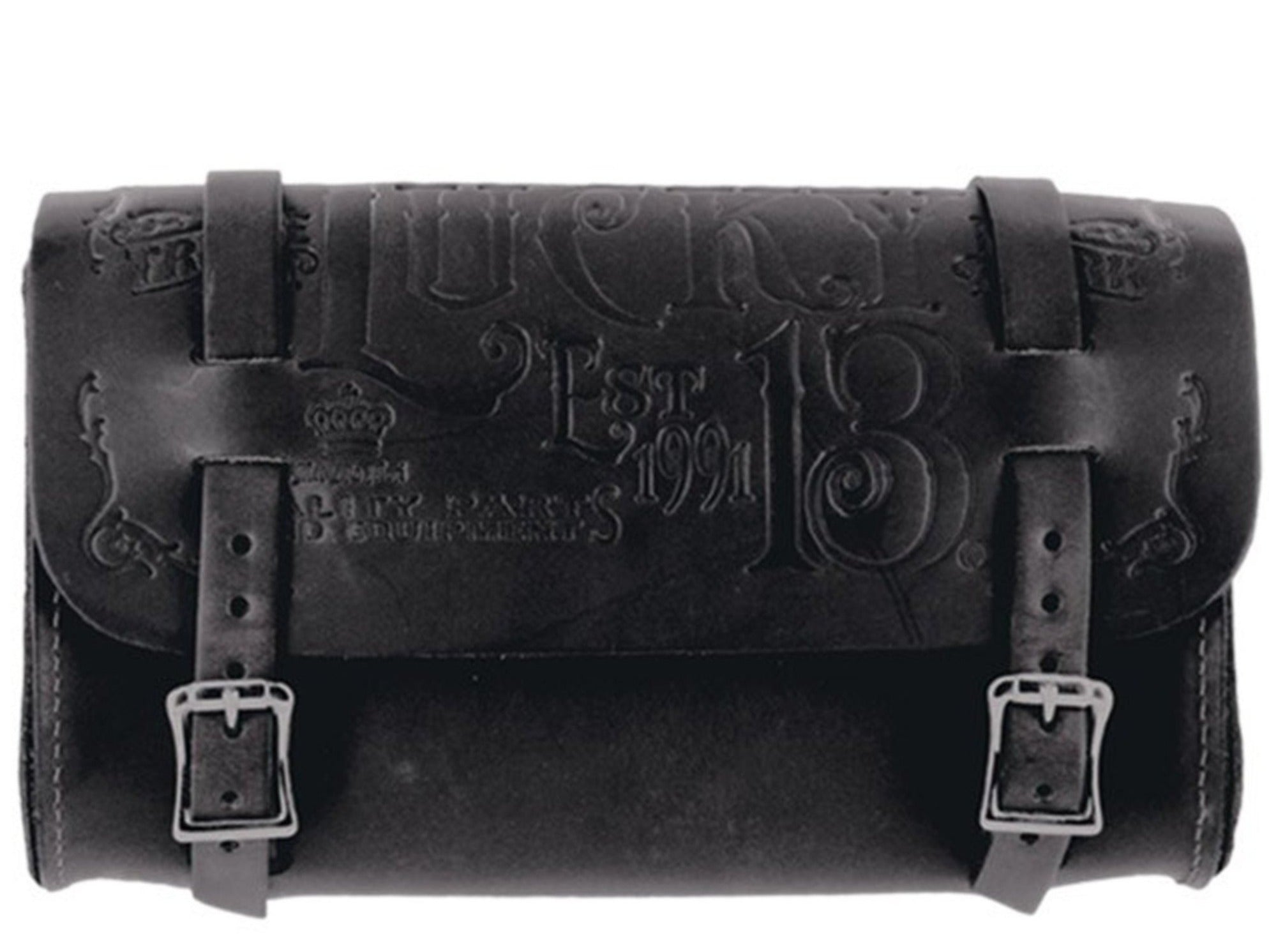 The M.F.G. CO Tool Pouch, keeps your tools, wallet, cell phone and anything else you need on your ride safe and secure! These 9.5-inch x 5.75-inch genuine leather tool pouches have extra wide straps to connect them to your bike (or whatever) and have Lucky 13 artwork embossed on the front.