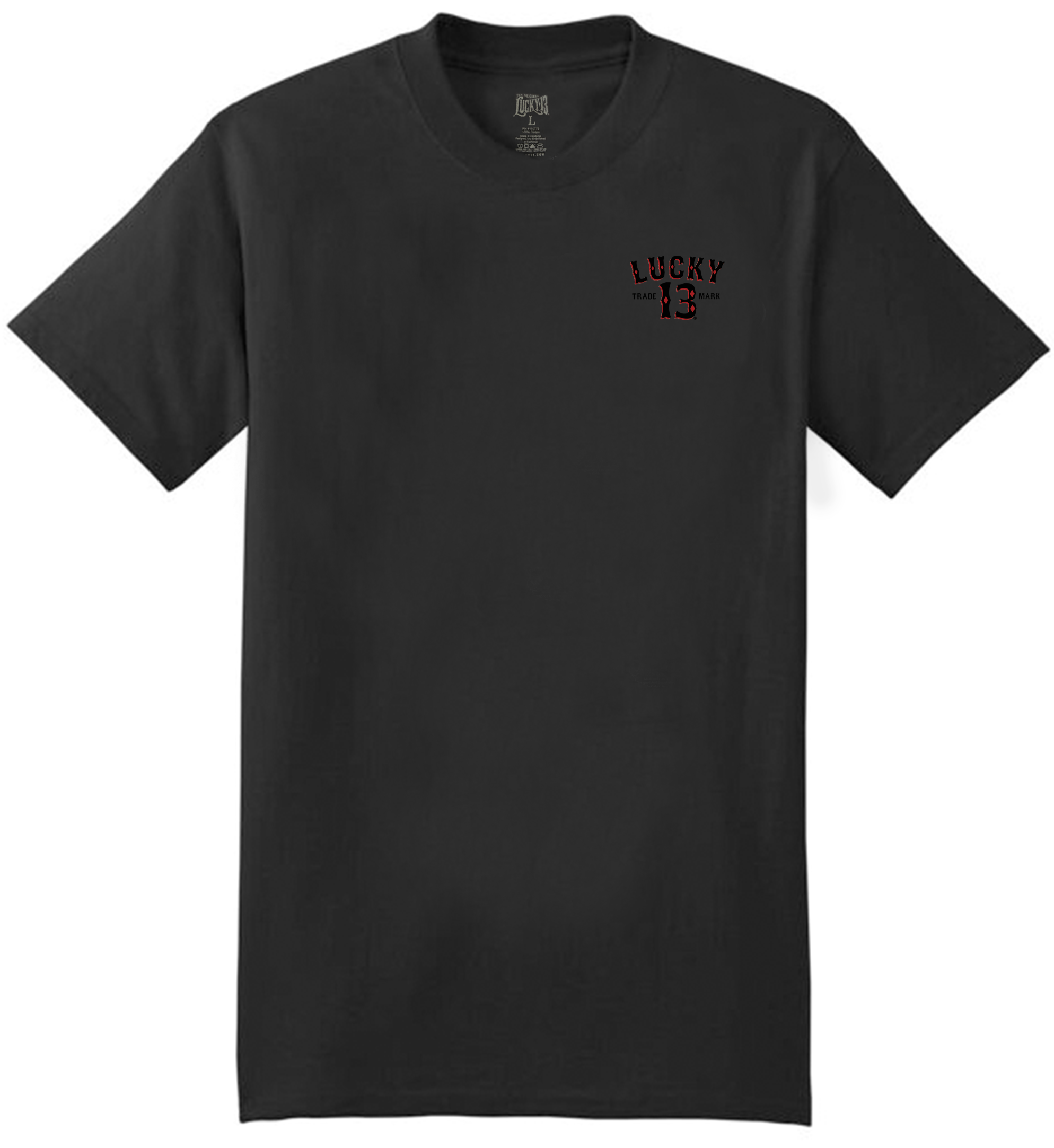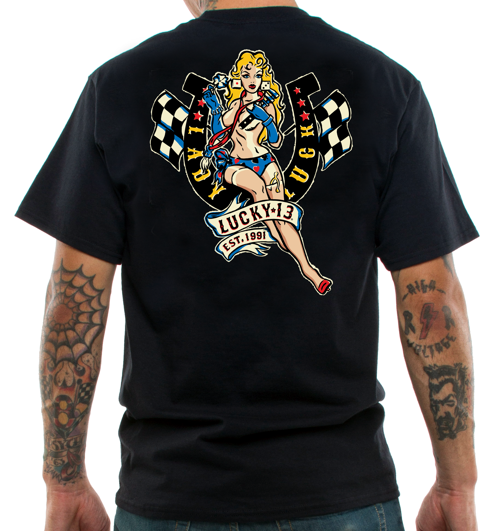 The LADY LUCK short sleeve men's tee is made with a 6.1 ounce 100% soft-spun cotton tee with a 1x1 rib-knit collar, shoulder to shoulder taping, cover-seamed neck, and double-needle sleeves. There is a full back screen print of a classicly styled "Lady Luck" graphic and a front left chest print to match.