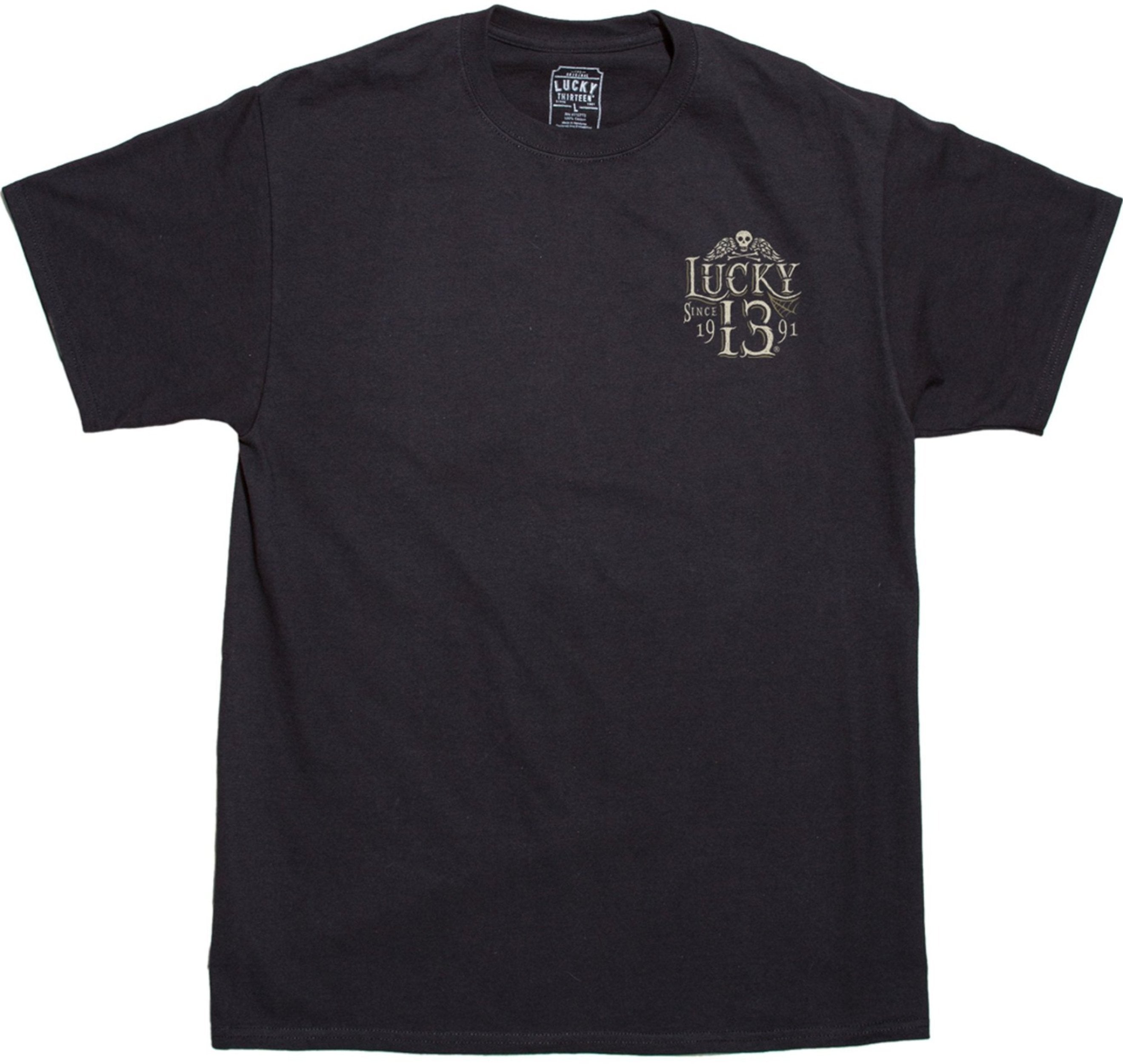 The DEAD SKULL short sleeve men's tee is made with a 6.1 ounce 100% soft-spun cotton tee with a 1x1 rib-knit collar, shoulder-to-shoulder taping, cover-seamed neck, and double-needle sleeves. There is a full back print of the "Dead Skull" Dia De Los Muertos logo, and a "Lucky Thirteen" front left chest print as well.