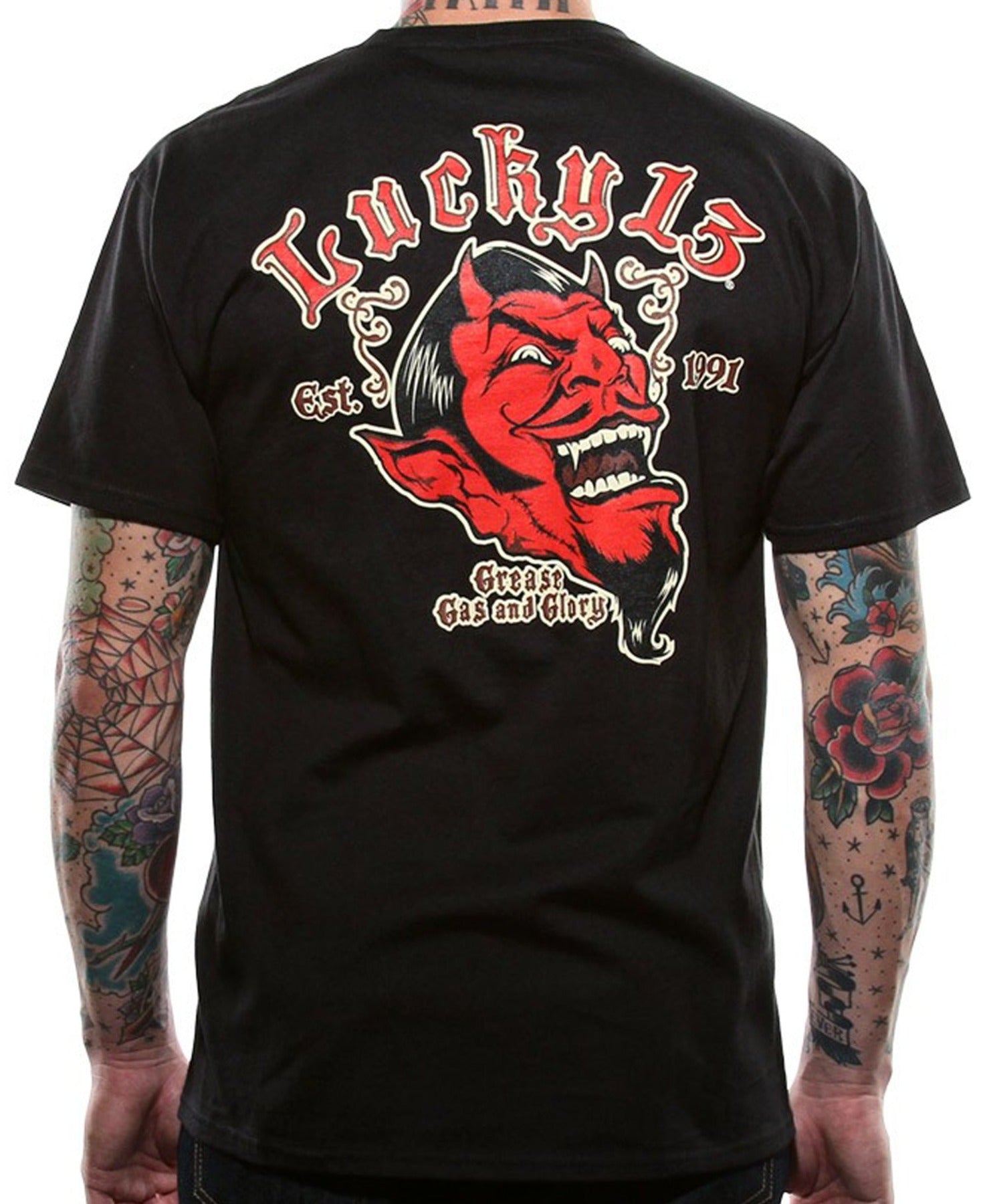The GREASE, GAS & GLORY short sleeve tee is a soft spun heavyweight 6.1 ounce 100% cotton short sleeve tee, with 1x1 rib knit collar, shoulder to shoulder taping, cover-seamed neck and double needle sleeves. This classic design features a full back print of our "Grease, Gas & Glory" Devil Head design and a front left chest to match.