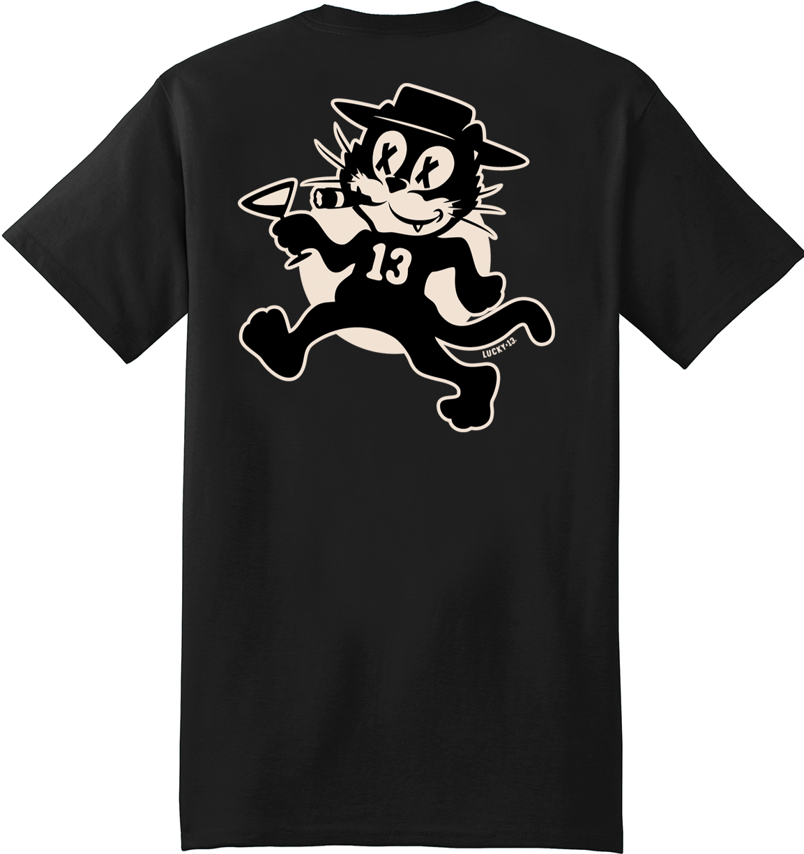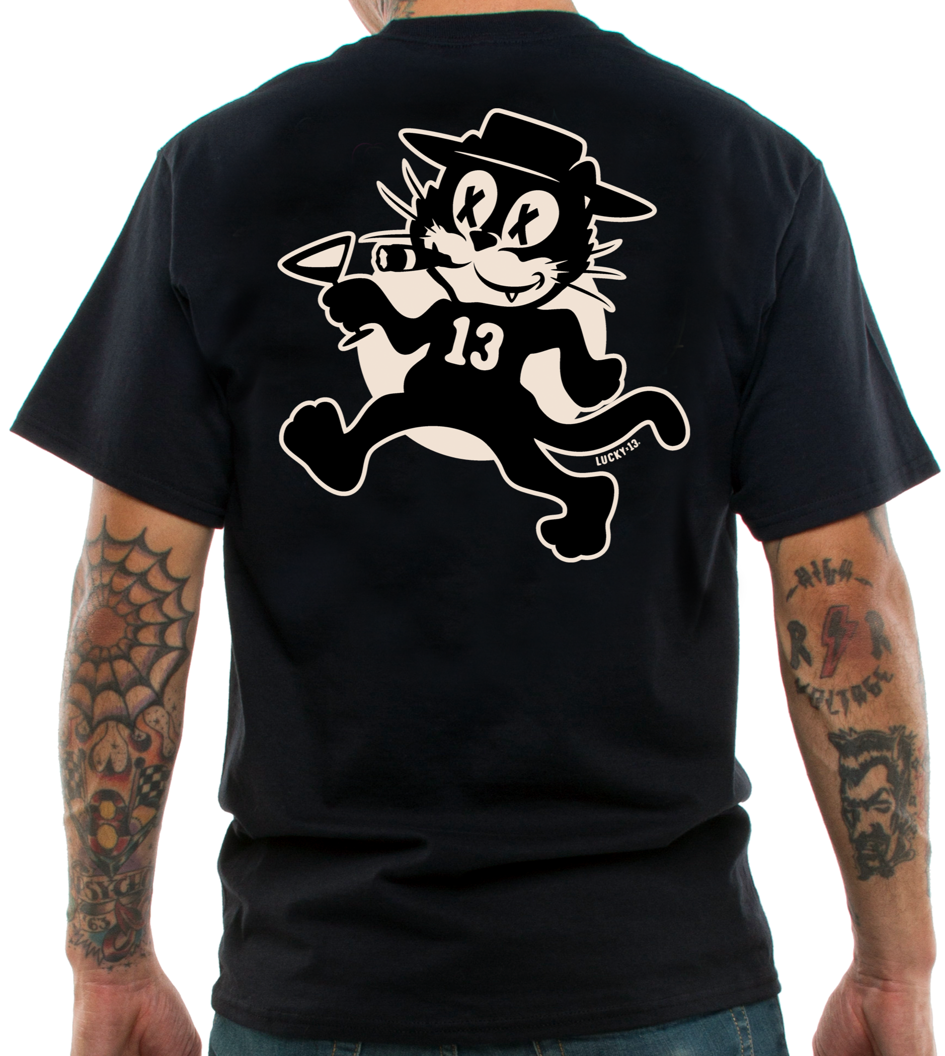 The TOMCAT short sleeve men's tee is made with a 6.1 ounce 100% soft-spun cotton tee with a 1x1 rib-knit collar, shoulder to shoulder taping, cover-seamed neck, and double-needle sleeves. There is a full back screen print of the retro style "Tomcat" graphic, and a front left chest Lucky 13 logo to match.