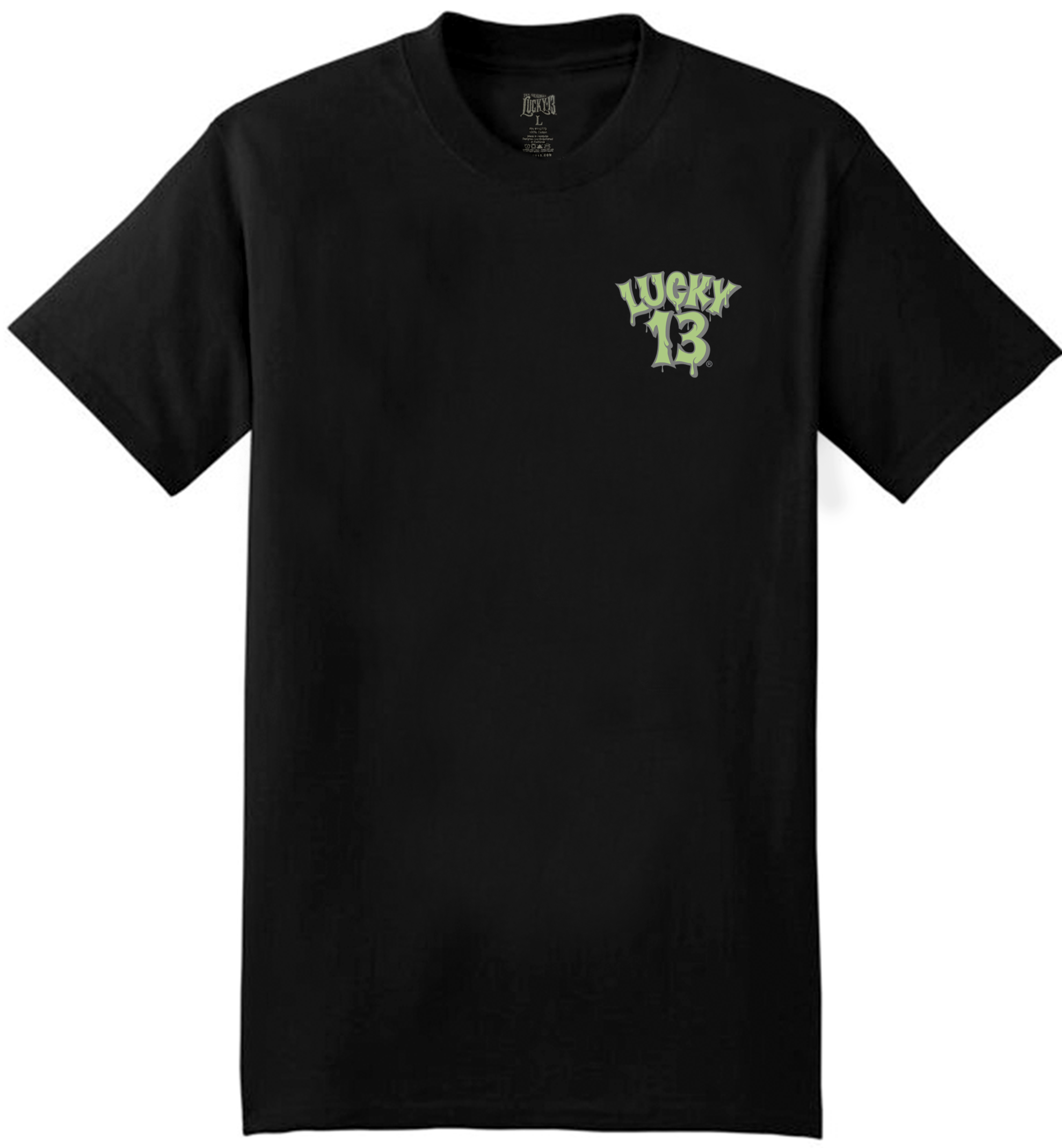The BAT VAMP short sleeve men's tee is made with a 6.1 ounce 100% soft-spun cotton tee with a 1x1 rib-knit collar, shoulder-to-shoulder taping, cover-seamed neck, and double-needle sleeves. There is a full back screen print of the vintage B-Movie-inspired "Bat Vamp" graphic of a bat-winged vamp with the words "Monster Fan Club" in the wings and a front left chest Lucky 13 logo to match.