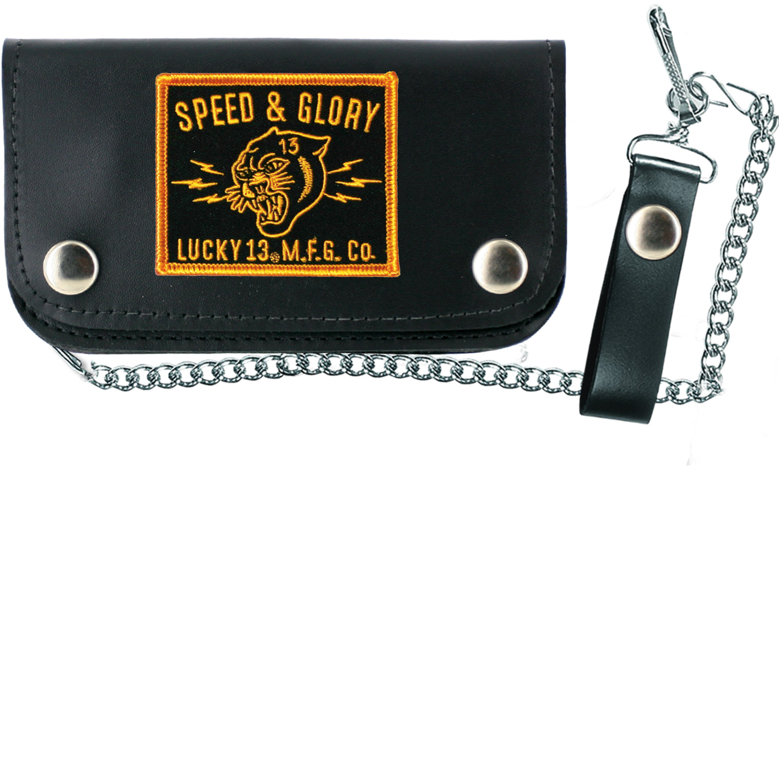 The PANTHER HEAD wallet is a 6-inch genuine leather chain wallet, with snap closures and a chain with a leather clasp to hook on your belt. A cool vintage style embroidered patch of the "Panther Head - Speed & Glory" design sewn on top.