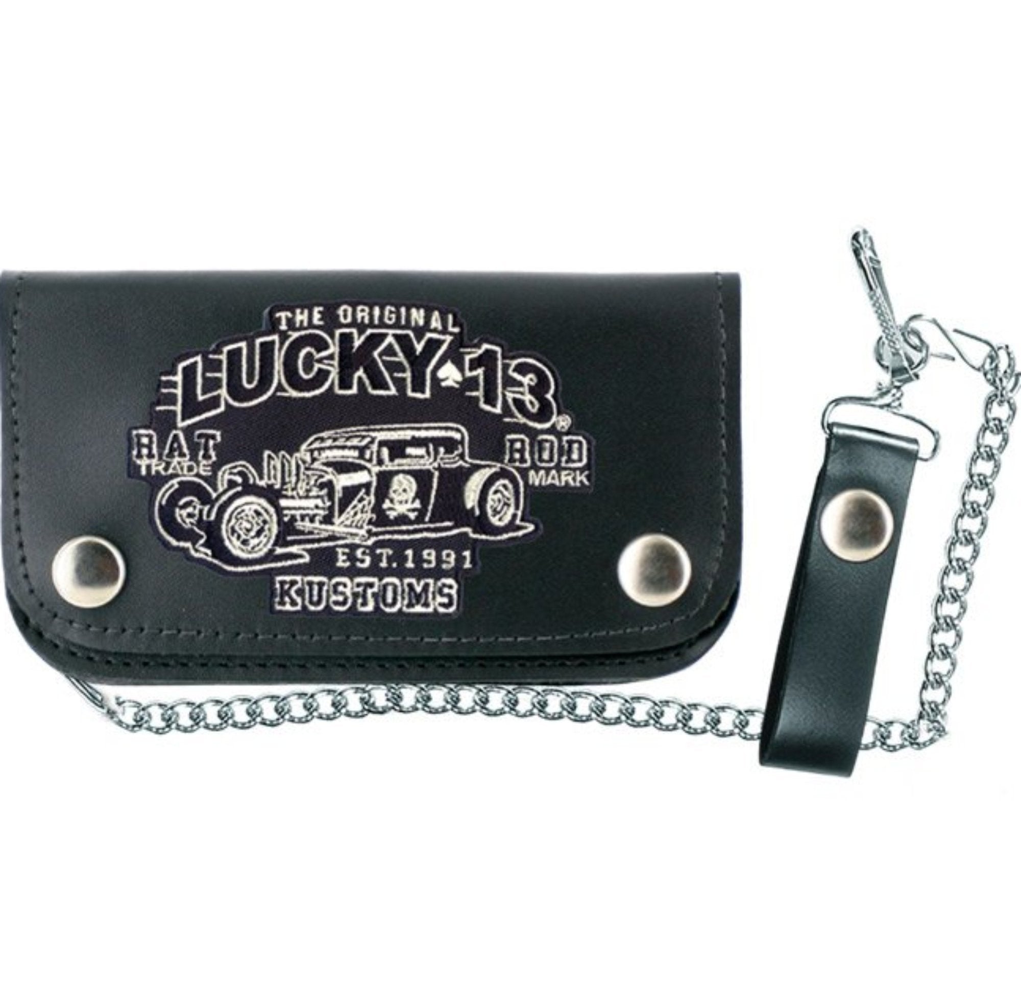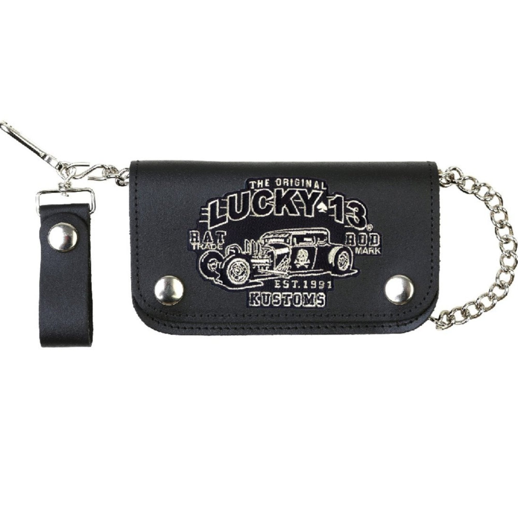 The RAT ROD wallet is a 6" genuine leather wallet with chain, leather clasp, and a fully embroidered patch of our "Rat Rod" design.