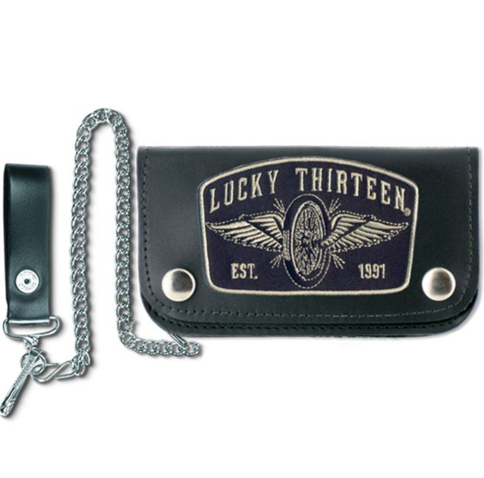 The SPEEDSTER wallet is a 6" genuine leather wallet with chain, leather clasp, and a fully embroidered patch of our "Speedster" design.