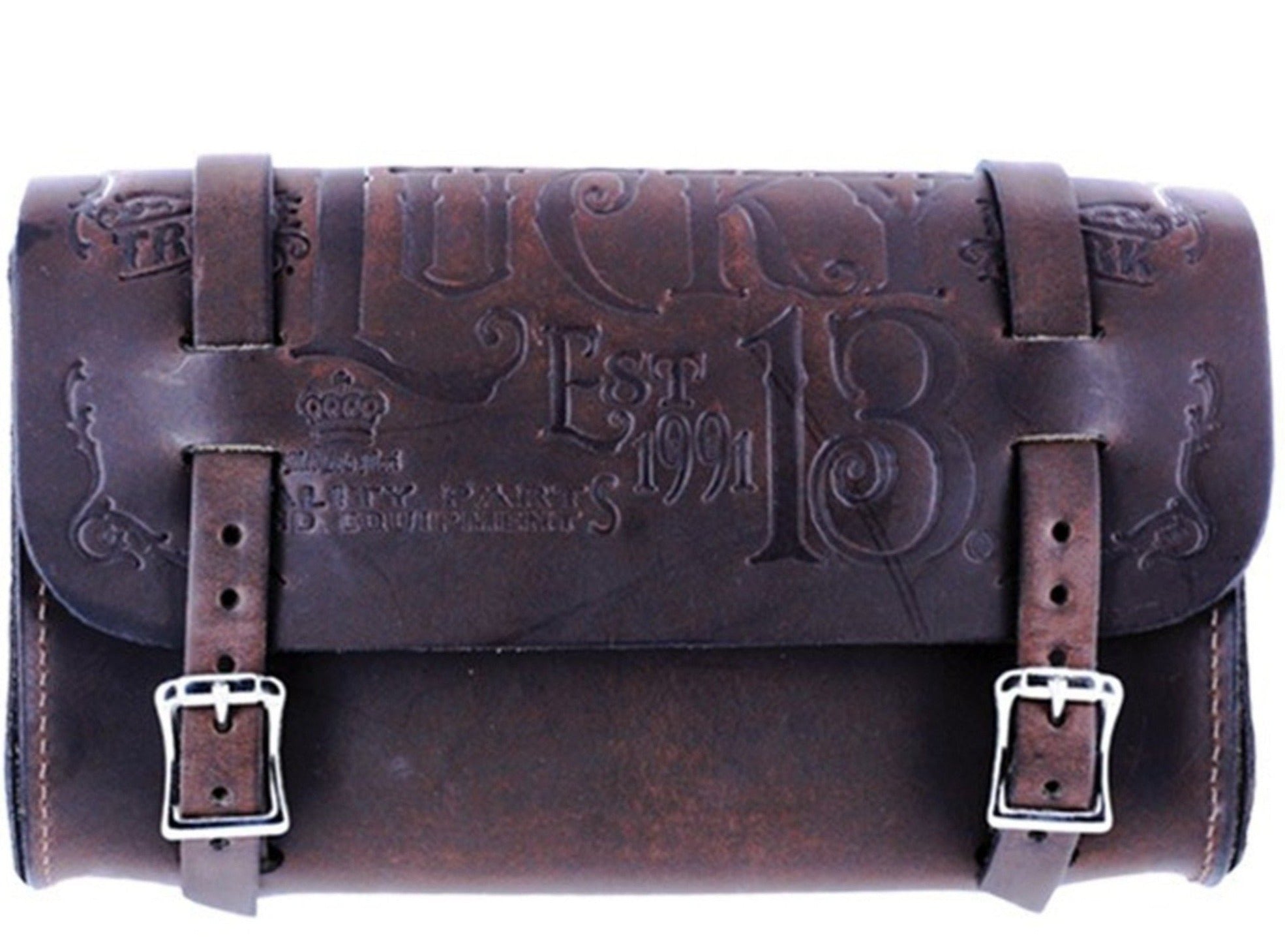 The M.F.G. CO Tool Pouch, keeps your tools, wallet, cell phone and anything else you need on your ride safe and secure! These 9.5-inch x 5.75-inch genuine leather tool pouches have extra wide straps to connect them to your bike (or whatever) and have Lucky 13 artwork embossed on the front.