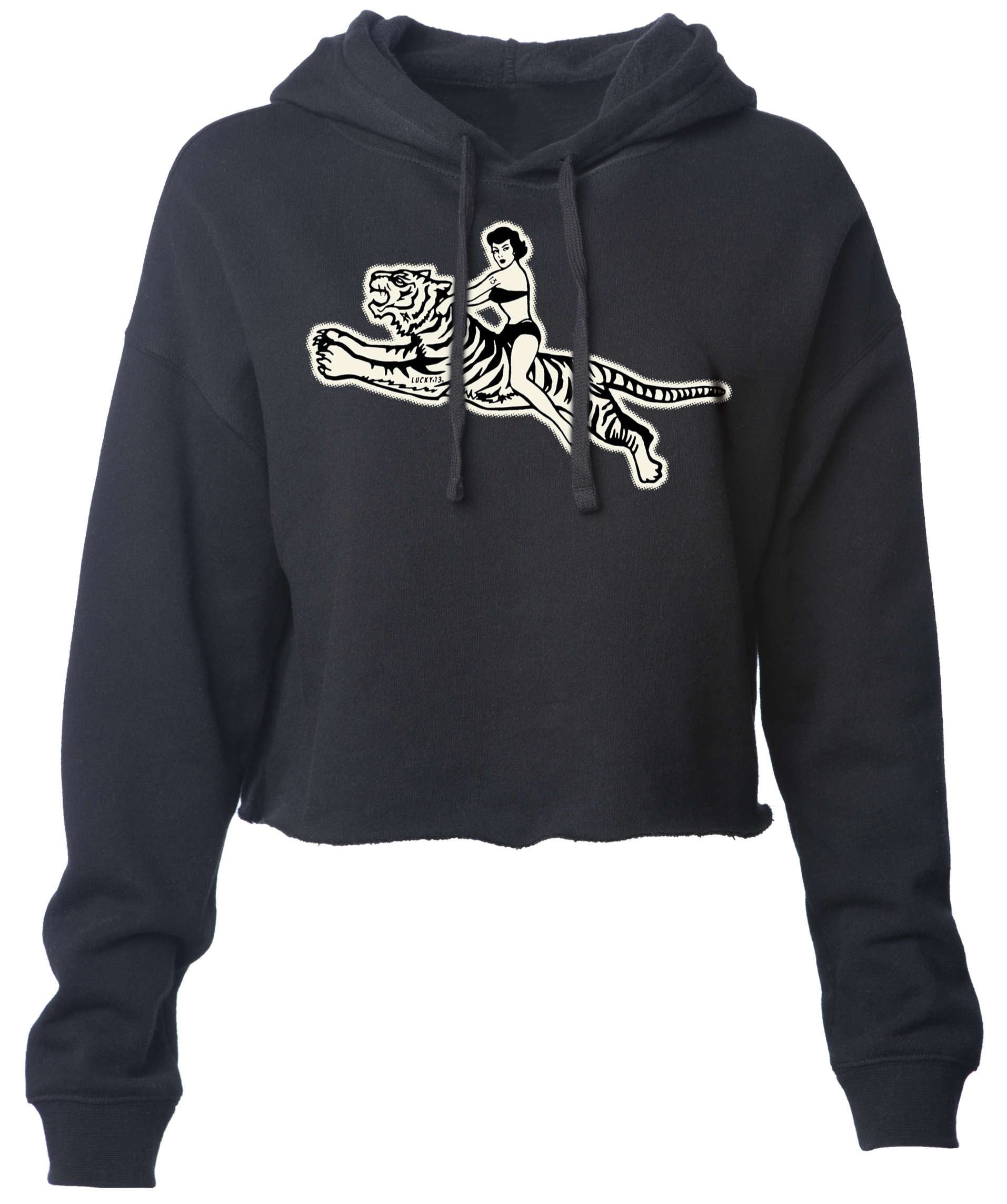 The UNLEASHED cropped hoodie is made with a 6.5 oz (210 gm) pre-laundered 80% ring-spun cotton/20% polyester blend fleece body with split stitch double needle sewing on all seams. 3/8" flat drawcord in the hood, with twill neck tape, sewn eyelets and 1x1 ribbing at the cuffs. The vintage-style "Unleashed" graphic of a pin-up riding her tiger is printed on the front chest. Super cute and flirty and cute for those cool Summer evenings.
