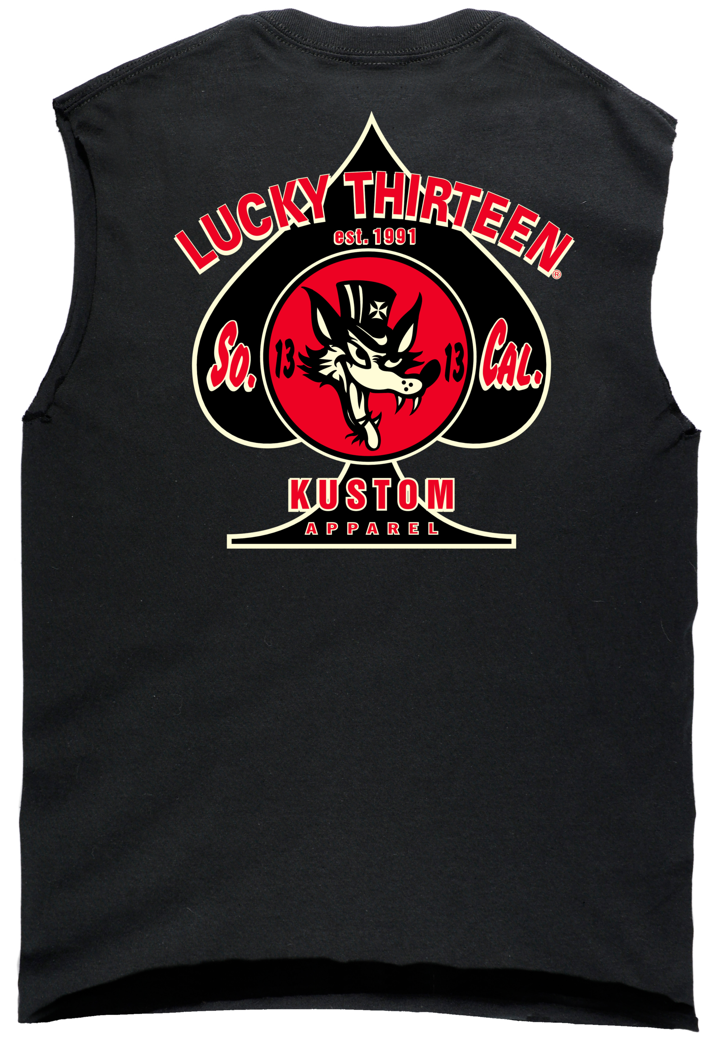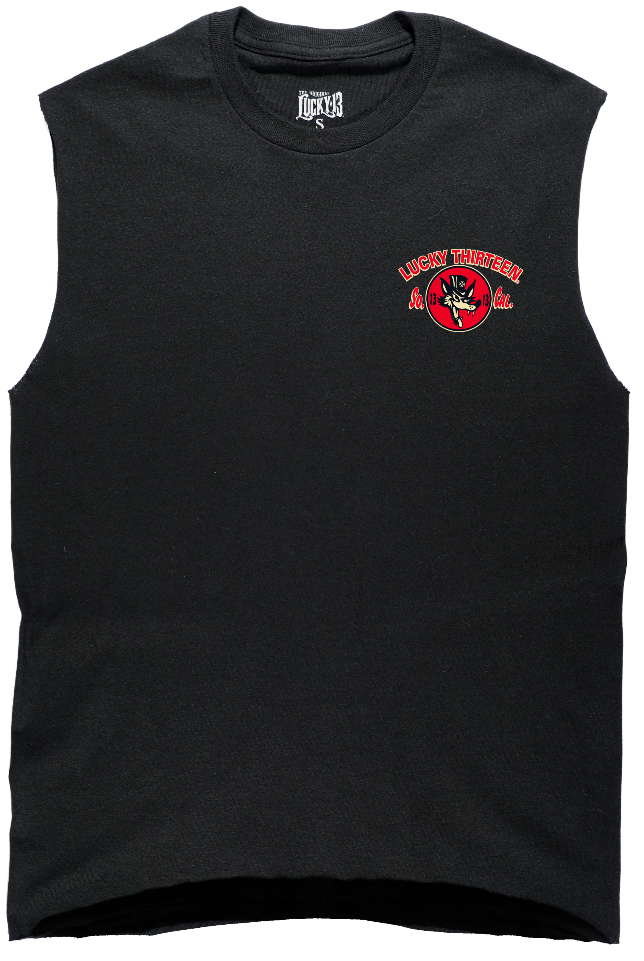 The WOLFY customized women's muscle tee is made with a loose fit 6.1 ounce 100% soft-spun cotton tee with a 1x1 rib-knit collar, shoulder-to-shoulder taping, and cover-seamed neck, and double-needle sleeves. We have hand-cut the armholes as well as trimmed off the bottom hem just a bit, for a cool and classic boxy cut look. There is a full back screen print of the "WOLFY" graphic and front left chest "Lucky 13" pocket logo to match.