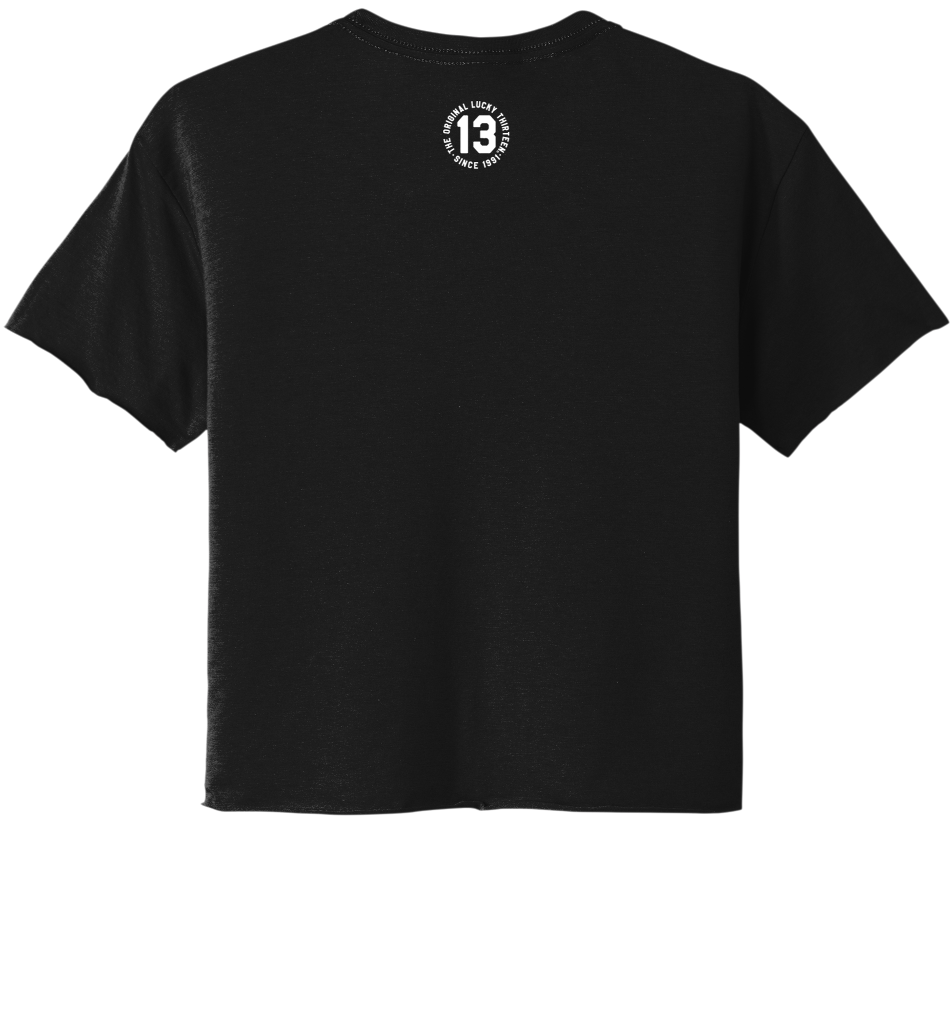 The BORN TO LOSE women's crop top is made with a 3.5 oz 65/35 poly/combed ringspun cotton, 40 singles relax-fit crop top with a 1 x 1 rib knit neck, raw edge sleeves, and bottom hem. It has a printed neck label, and the "Born To Lose" graphic printed on the front chest with a small Lucky 13 logo on the upper back.