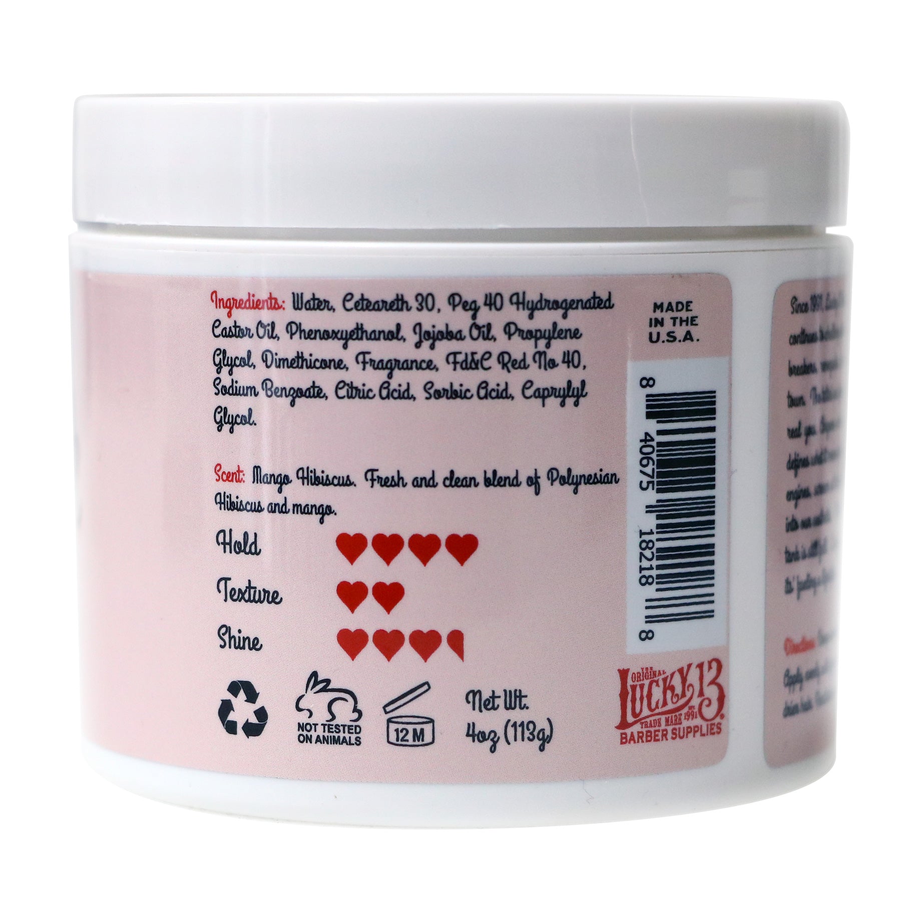 LADY LUCK pomade is strong hold, water-based product with high shine. The sweet Polynesian Hibiscus mixed with a little Mango scent makes it easy to wear all day long. Perfect for throwing on and going out to a picnic or car show, this classic pomade will become your favorite part of getting ready!