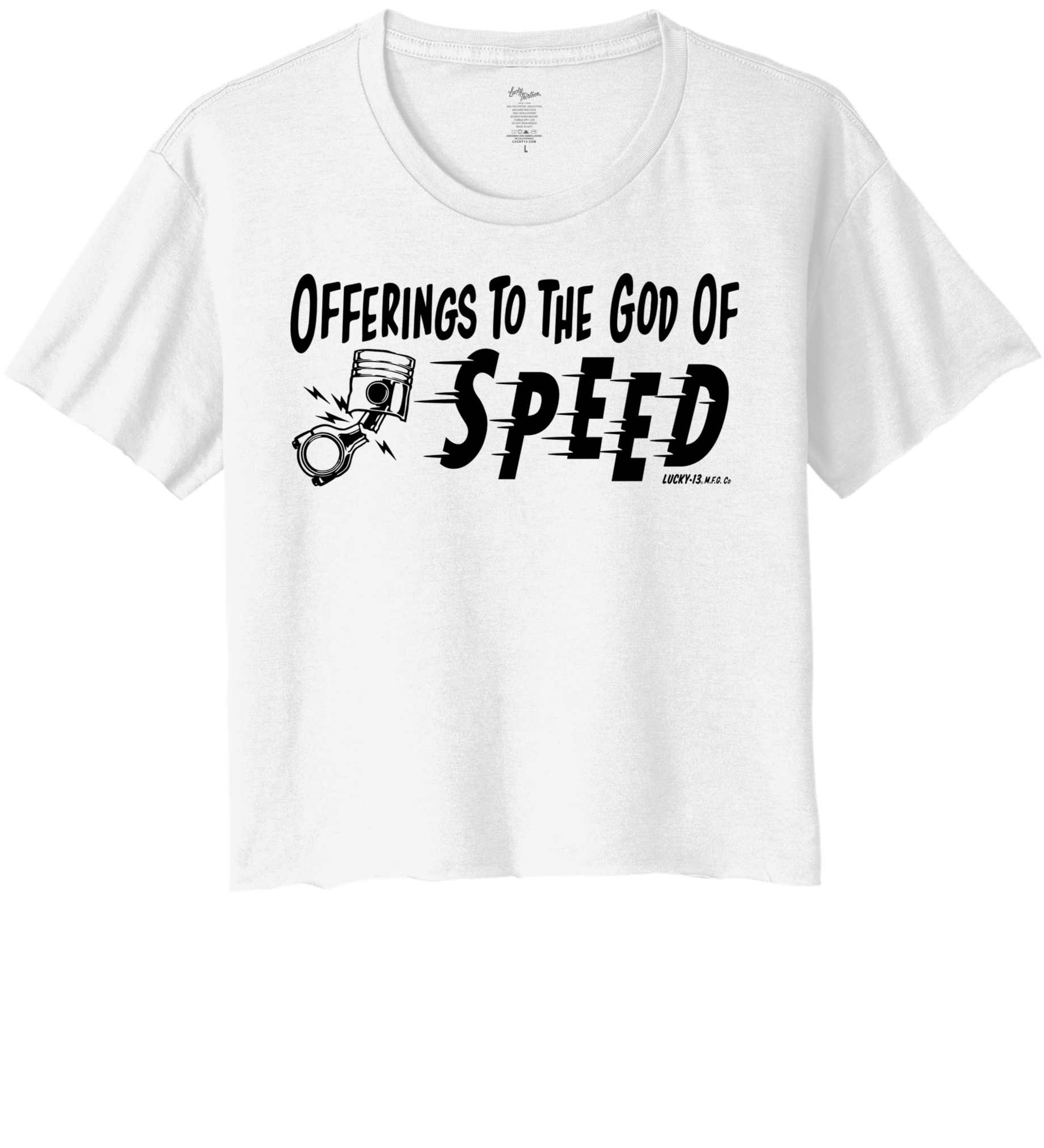 The OFFERINGS TO THE GOD OF SPEED Women's crop top is made with a 3.5 oz 65/35 poly/combed ringspun cotton, 40 singles relax-fit crop top with a 1 x 1 rib knit neck, raw edge sleeves, and bottom hem. It has a printed neck label and the "Offerings To The God Of Speed" broken piston graphic printed on the front chest.