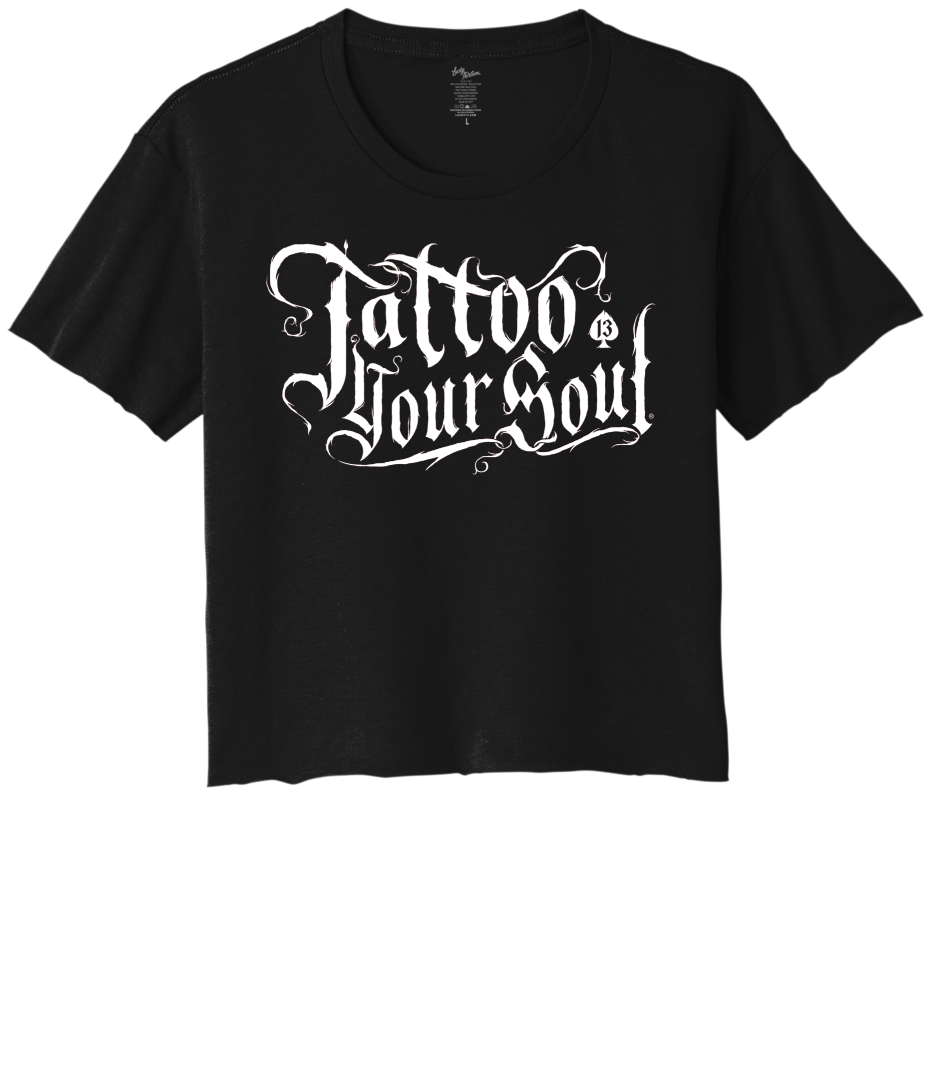 The TATTOO YOUR SOUL women's crop top is made with a 3.5 oz 65/35 poly/combed ringspun cotton, 40 singles relax-fit crop top with a 1 x 1 rib knit neck, raw edge sleeves, and bottom hem. It has a printed neck label and the "Tattoo Your Soul" graphic printed on the front chest.
