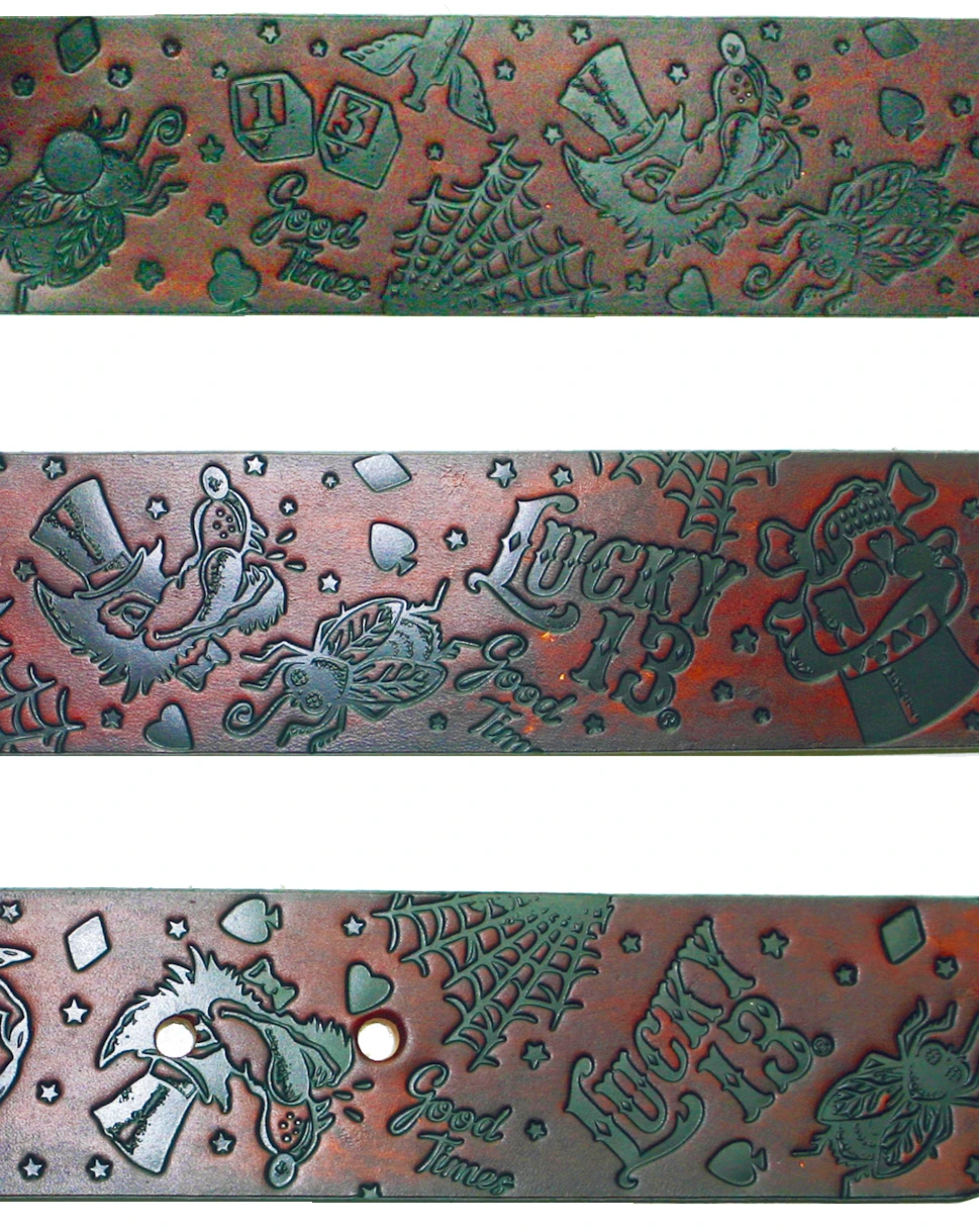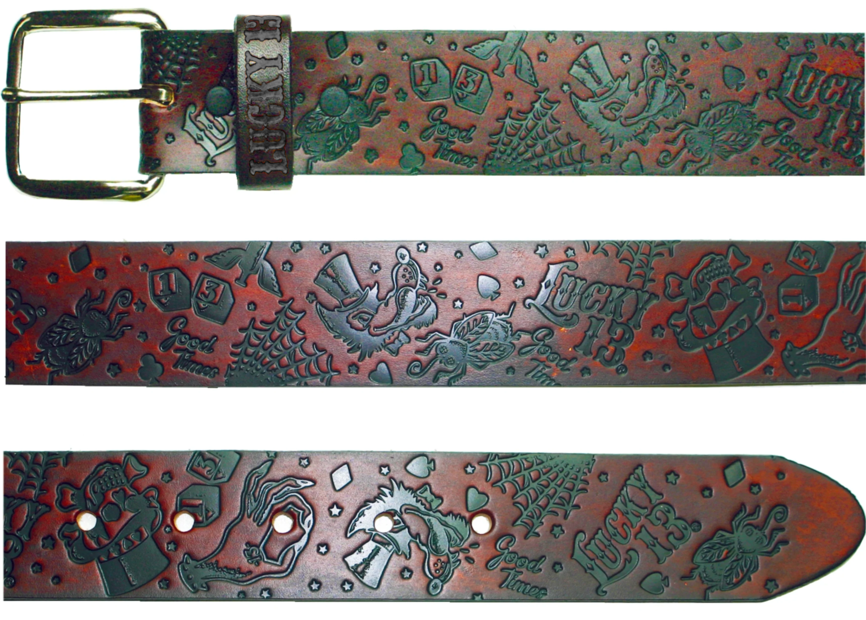 The HIGH ROLLER belt is embossed with various iconic tattoo flash style images the entire length of this genuine leather belt. Each belt is hand-stained brown and black making no two alike. Each comes with a sturdy removable metal buckle included. Dress it up or dress it down, you will be wearing a classic vintage Americana style belt that is sure to get you noticed.